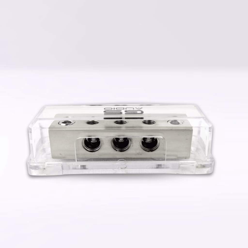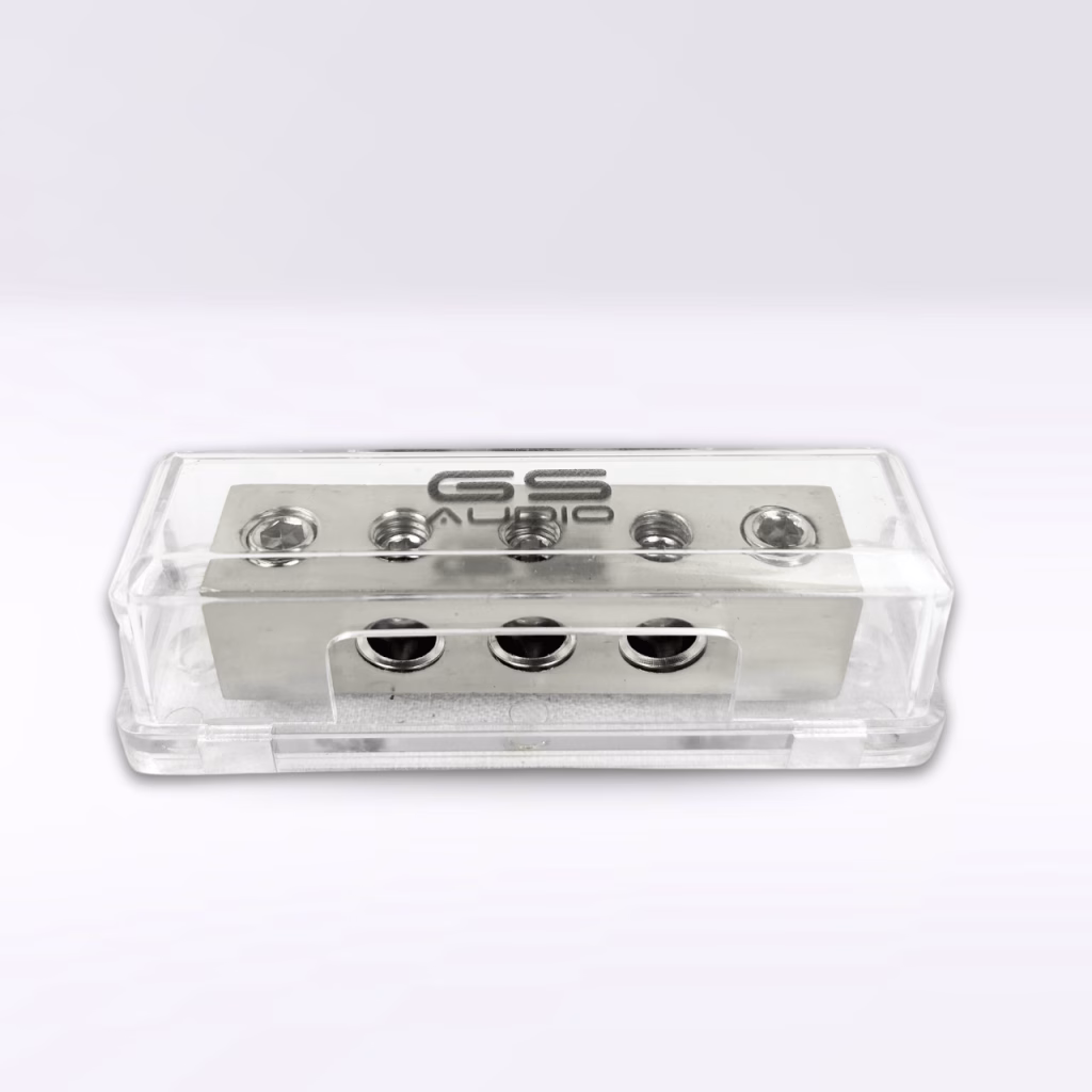 5-Way Power Distribution Block GS Audio | IN/OUT: 2×50 3x25Connections: up to 5 connections divided into 2 input or output connections 50mmq and 3 input or output connections 35mmq5-way power distribution block, ideal for car hi-fi audio systems. Built with durable materials and plated contacts, ensures stable conduction over time. Design with deep housings protects connections, while oversized screws ensure secure tightening even in harsh conditions. Reliable, practical and designed for professional installations. Key features:Type: 5-way power distribution blockCable compatibility: up to a maximum cross-section of 50 mm²Resistant to high temperaturesCover: shockproof clear plexiglass protective cover with engraved GS Audio logoMounting holes: prepared for secure mounting on panels or structuresUsage: Secure distribution for audio and vehicular electrical systemsApplications:Car audio systems (car hi-fi)Electrical systems on motor homes (RVs)ATV and off-road vehiclesNautical electrical systems (boats and boats)Safe power distribution to amplifiers and auxiliary devicesSystem protection from overloads and unstable connections