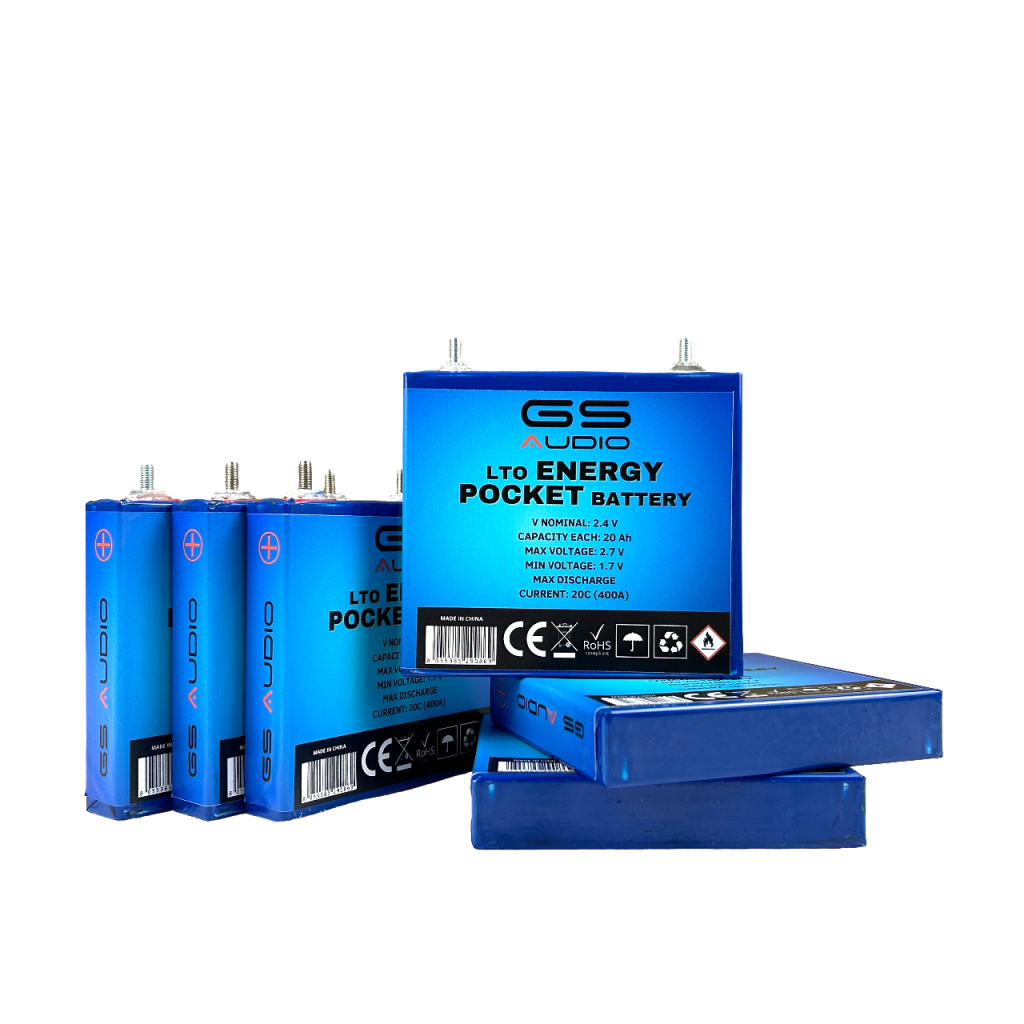 6 CELLS GS AUDIO LTO – 2.4V / 20Ah – 108*116*22mm – TITANIUM LITHIUMThe price is for 6 single cells without accessories, bolts, bars, etc. which can be purchased separately according to your needsThese are 2.4V cells and 20 Amps each; put in series they form a 20A battery with a voltage of 14.4 volts. There is only one worldwide manufacturer of these cells, and that is Toshiba, which produces only 20A cells. Be wary of those who quote higher numbers on their labels.Charging between 14.4 and 15 volts is recommended. If your alternator operates at a voltage lower than 14.4 volts, an upgraded alternator is recommended. All of our GS AUDIO cells are Grade A, with an extremely low internal resistance, guaranteed to be less than 0.35 milliohm.➡️SHIPPING THROUGHOUT EUROPE⬅️ Upon request, we can make kits of 6, 12, 18, 24, 30, 60, 120 and more cells, assembled according to the scheme you prefer, with BMS and bars, ready to be installed in your car!SINGLE CELL RATINGSModelGS – 20 LTODimensions 108 x 116 x 22 mmWeight / Volume0.520 KG / 0.26 LNominal Voltage2.4 voltsNominal Charging Current40 ARated Discharge Current40 A Maximum charging current100 AMaximum discharge current20C = 400AConnection threadsM5 Internal resistance>> Will not cause fire or explosion.Excessive discharge, cold, low atmospheric pressure, high temperature changes >>> Will not cause fire, explosion or leakage. LTO CHARACTERISTICSWhat does a lithium titanate battery look like? In the LTO battery, lithium titanate oxide (Li2TiO3) replaces graphite (carbon) in the anode, an element found in classic lithium-ion batteries. The cathode can be lithium manganese oxide (LMO) or lithium manganese cobalt oxide (NMC).Under the microscope, the LTO reveals a three-dimensional structure consisting of lithium titanate nanocrystals. The cell has a voltage of 2.4 V, can be recharged quickly, and can withstand a discharge current of up to 10 times its rated capacity.BENEFITSThe advantages of the new lithium titanate battery technology lie mainly in the anode surface area, which is about 100 square meters per gram, compared with only 3 square meters per gram in conventional lithium-ion batteries (3.7V). This greater surface area available for electron passage allows for rapid charging and longer battery life. This means that less charging power is required and these batteries can be safely recharged in about 6-10 minutes, rather than the 8 hours required for other rechargeable batteries. In addition, the charging efficiency exceeds 98%.RISKSThe lower operating voltage (2.4V) compared with conventional lithium cells (3.7V) offers advantages in terms of both safety and environmental impact. The absence of carbon in lithium titanate batteries reduces the risk of thermal instability and overheating, which are the main cause of fires in traditional storage systems.According to tests conducted and verifiable by any LTO manufacturer in the world, an LTO cell subjected to a short circuit reached a maximum temperature of 90-100°C without causing explosions or fires, phenomena to which traditional lithium-polymer batteries can be subjected.