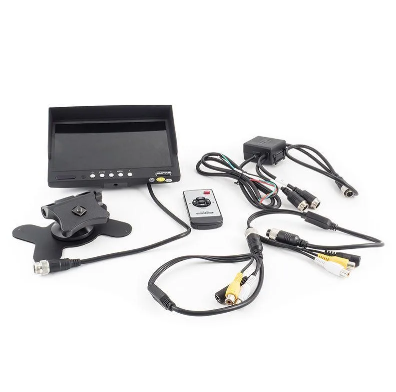 Korkearesoluutioinen 17,8 cm: n (7 ′′)TFT näyttö. Kaksi sisääntuloa, kameralle tai videosignaalille. Voit tietenkin myös kytkeä DVD-soittimen tai DVB-T-vastaanottimen videosignaalin viihdyttääkseen matkustajia ajon aikana.