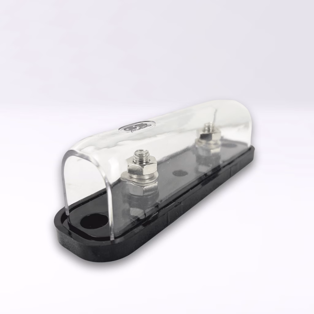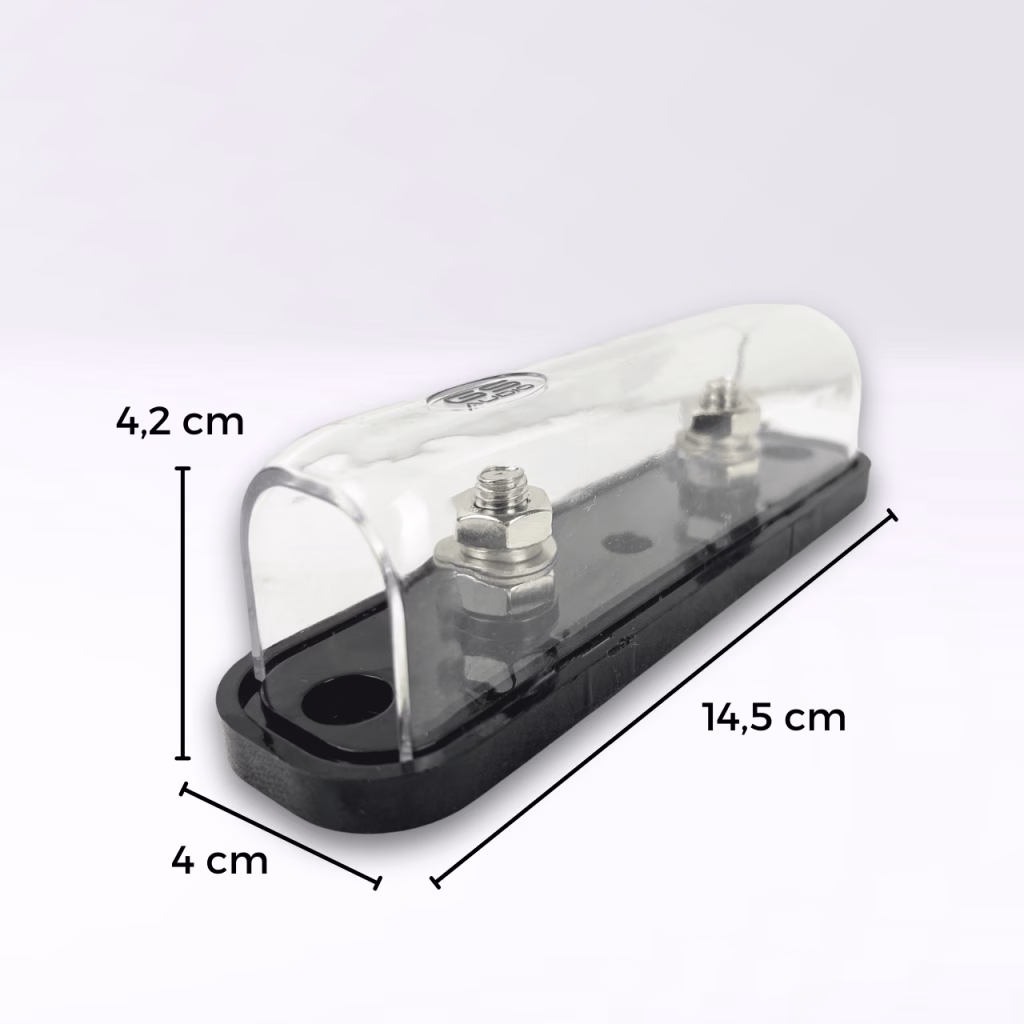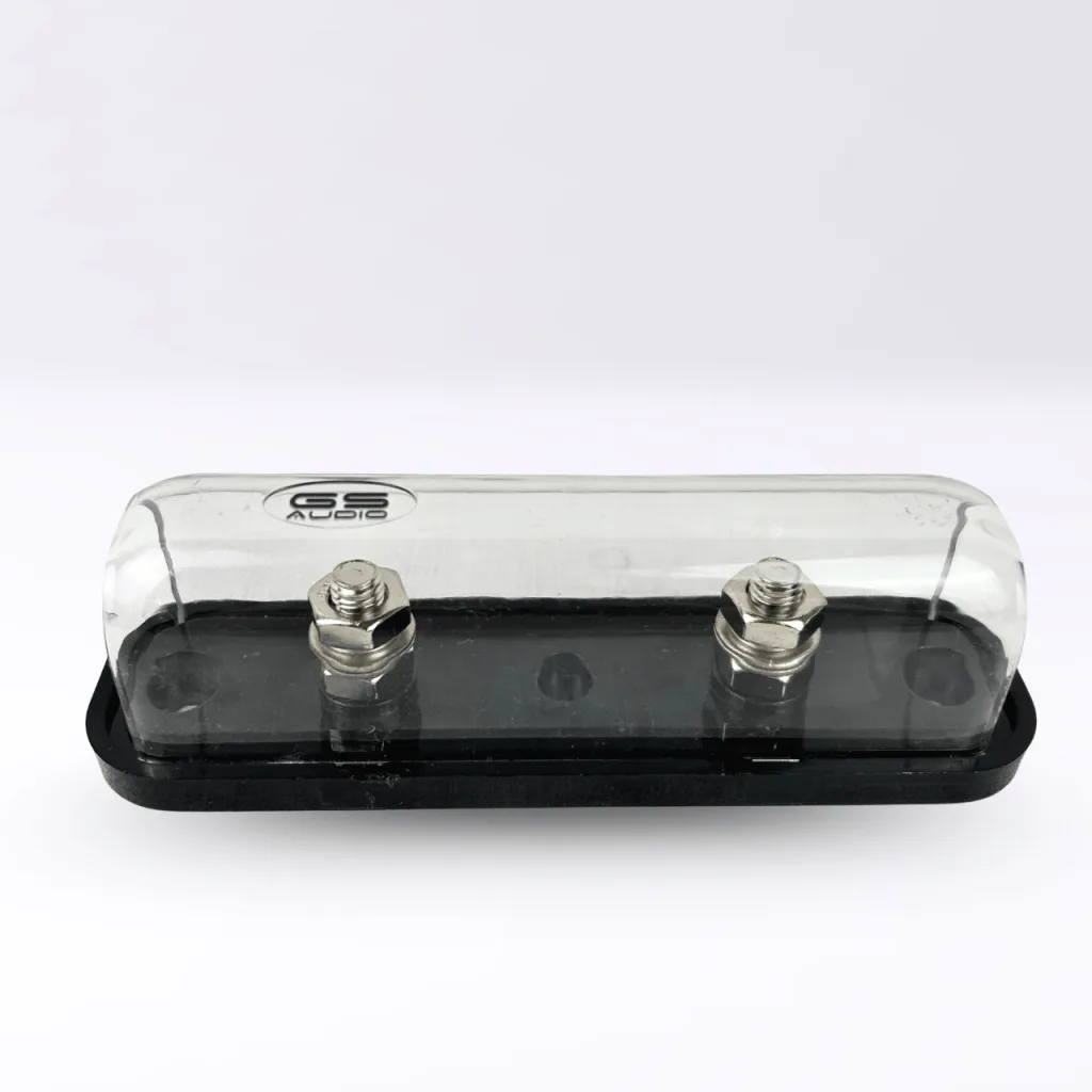 ANL Fuse Holder with M8 Terminals – Up to 100mmq | GS AudioConnections: 2 screw terminals with stainless steel M8 boltsFuses not included: compatible with ANLProfessional ANL fuse holder with M8 bolt connections designed for high-current applications in car audio, marine, industrial or specialty vehicle systems. Allows safe housing of ANL fuses, providing overload and short circuit protection on main power lines.Main features:Type of fuse supported: ANL Cable compatibility: M8 eyelets up to a maximum cross section of 100 mm²Cover: shockproof clear plexiglass protective cover with engraved GS Audio logoMounting holes: prepared for secure mounting on panels or structuresApplications:High-power car audio systemsConnection between batteries or LTO/LiFePO4 banksInstallations on RVs, industrial and marine vehiclesProtection of main power supplies or lines from oversized alternators Want to match a fuse? Buy it on our website, ANL up to 600A and AFS up to 150A available.