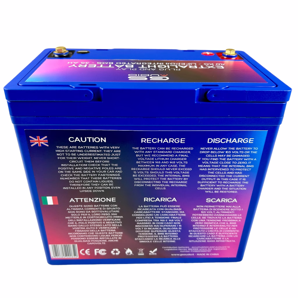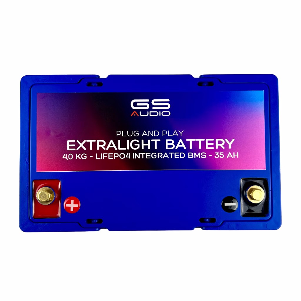 35Ah LifePo4 13.2V Extralight Battery 4.0kg – Gs Audio – CCA:1350AHigh-performance ultralight battery for sports car audio systems and starters.GS Audio’s new generation of ultralight LiFePO4 batteries are designed to offer maximum performance while occupying the minimum possible space.The main distinguishing features compared to other LiFePO4 lithium batteries are:1) very high current output, thanks to multiple internal BMSs;2) special ultralight cells with high current delivery capacity.These batteries can also be used on RVs and in situations requiring energy storage, but they best express their potential on everyday cars with sound systems, winches, or other high instantaneous electrical loads, or for those who simply want to reduce weight. Currently available sizes are:20Ah-M5 (weight 2.3 kg) – box with screw-mounted poles30Ah-MINI ISO (weight 3.5 kg) – rectangular with small poles35Ah-ISO (weight 4.6 kg) – ISO box with regular poles35Ah-M6 (weight 4.0 kg) – box with screw connection poles70Ah-ISO (weight 7.4 kg) – ISO box with regular poles70Ah-M8 (weight 7.3 kg) – box with screw connection poles100Ah-ISO (weight 9.1 kg) – ISO box with regular poles100Ah-M8 (weight 9.8 kg) – box with poles screw connection Weight 4.0 KGCapacity: 35Ah – CCA: 1300A approx.Measurements: Width 22.3 cm x Depth 13.4 cm x Height (without poles) 20.8 cm / Height with poles 21.5 cmInternal resistance less than 2.8 mΩRated voltage 13.2VCharging voltage: 14.6VMaximum protection voltage of the internal BMS: 15.5VWorking temperature : -20/+70 degreesFor automobile ignition with motors up to 3000 DC displacementIdeal for audio systems with amplifiers up to 2000w for daily use or 3000w for short audio competitions (spl)Integrated active BMS card for protection and leveling of individual cells GS Audio LiFepo4 batteries should not be mounted in systems that have other types of batteries mounted (AGM, lead acid, LTO, ECC….).If you decide to mount Lifepo4 batteries you must change all the batteries in your car.GS Audio LiFepo4 batteries are made with huge quality cells, to have a high starting current required in the car audio world, without having overheating or fire problems. These batteries have a very low self-discharge; however, in the winter months or for non-use longer than 30 days, charging with our LIFEPO4 chargers is recommended to stabilize the cells.The cells are immersed in fireproof foam to preserve their qualities even after shocks, without causing fire or damage to them. With an average specific gravity of 153Wh/kg, they are among the lightest on the market compared to other technologies!- LTO (titanate) ~ 70 Wh/kg- AGM lead ~ 38 Wh/kg Batteries with lifepo4 technology have a life of about 2,000 charge and discharge cycles, about 6 times that of lead-acid batteries, which is about 300 cycles.In addition, respite conventional lead, LiFepo4 batteries do not contain heavy metals or acids that are harmful to the environment.