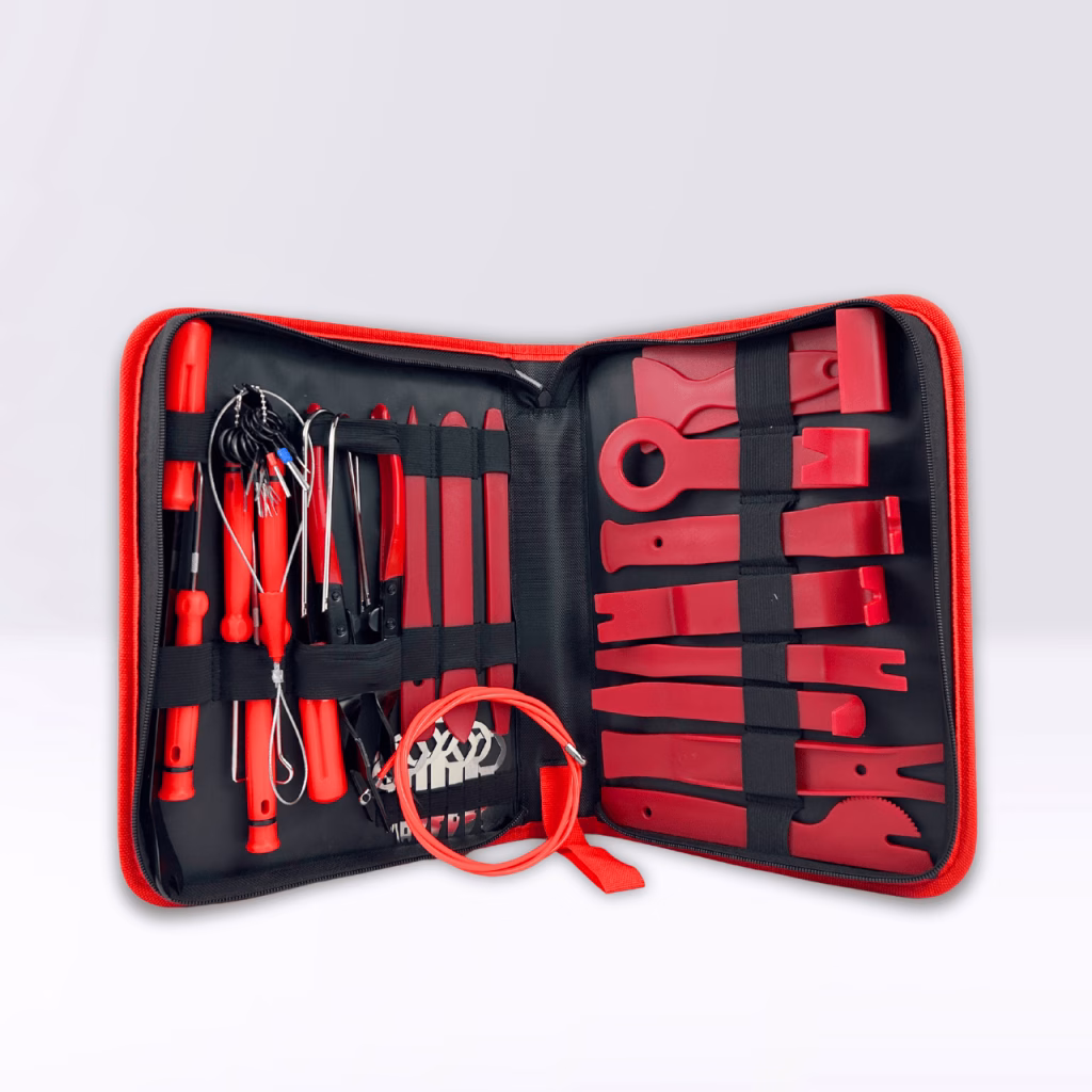 Car Panel Disassembly and Car Audio Installation Tool Kit – 43 Pieces with CaseThe professional GS Audio car panel disassembly kit is designed to make installation and maintenance work on car audio systems and car accessories easy and safe. Includes 43 tools including reinforced plastic levers, metal pullers, pliers, hooks and specific tools for removing upholstery, moldings, car radios and clips without damaging surfaces.Supplied in a convenient resealable zippered case that keeps everything tidy and easily transportable. Specifications.Complete set of 43 piecesScratch-resistant reinforced plastic toolsMetal extractors for car radiosPliers and hooks includedSoft pouch with zipper, practical and durableIdeal for: disassembling door panels, dashboard, moldings, car radios, clips and car interior accessories