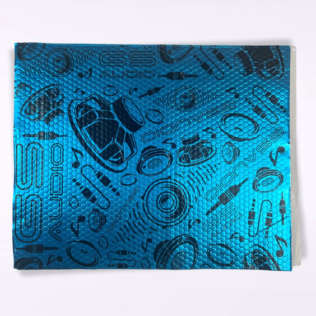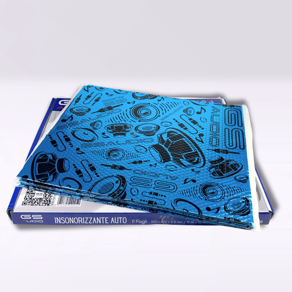 Damping Material GS Audio for Cars 11 Sheets 50x40x2.2mm Adhesive – 2.2m² | Acoustic and Anti Vibration InsulationProduct NOT sold individually. 11 sheets inside the packageTransform the acoustics and solidity of your vehicle with our Soundproofing Butyl + Aluminum – 11 Sheets 500 × 400 × 2.2 mm (total coverage 2.2 m²). Made of high-density butyl laminated with honeycomb-embossed aluminum foil, this material:Suppresses vibration and resonance: the butyl layer dampens unwanted frequencies, dramatically reducing rolling noise, resonant metal, and air rustling.Stiffens the structure: aluminum foil increases the strength of body panels, improving the car’s feeling of solidity.Insulates from heat: aluminum reflects radiant heat, keeping the passenger compartment and components cooler.Optimizes audio performance: with less vibration, speakers work in a controlled environment and sound is cleaner and more powerful. Where to apply itOn cars: roof, doors, wheel arches, trunk, hood, floor and parafirewall. Also compatible on other vehicles: RVs, caravans, farm vehicles, boats, vans and recreational boats. Main Features: Sheet size: 500 x 400 mmSheet thickness: 2.2 mmTotal coverage 11 sheets: 2.2 m² (11 × 0.2 m²)Material: self-adhesive butyl + blue honeycomb aluminumWeight per sheet: about 700g Advantages:Our soundproofing is designed to offer not only high performance, but also ease of use during installation. Thanks to the high-strengthindustrial adhesive, the sheets adhere perfectly even to curved or uneven surfaces, ensuring stability and durability. The material is easy to cut, working conveniently with simple scissors or a cutter, allowing you to precisely fit each sheet to the most complex areas of the vehicle.Aesthetically, the blue embossed aluminum finish gives a professional look with attention to detail as well, ideal for those looking for not only efficiency but also visual quality in their car trim. What’s more, modularity is a big selling point: each kit covers 2.2 m², but you can combine as many as you like to suit your needs. And if you only need one replacement panel, no problem – in the Soundproofing category you will also find individual sheets available separately.