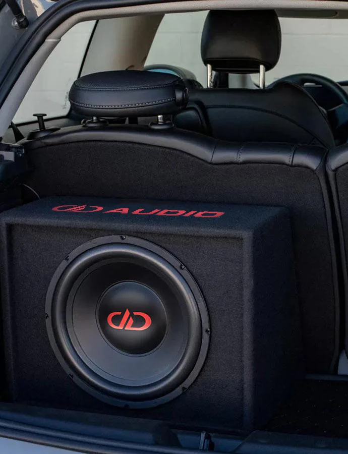 Kestävä MDF-kotelo, jossa on musta verhoilu, jota koristaa DD-Audio logo