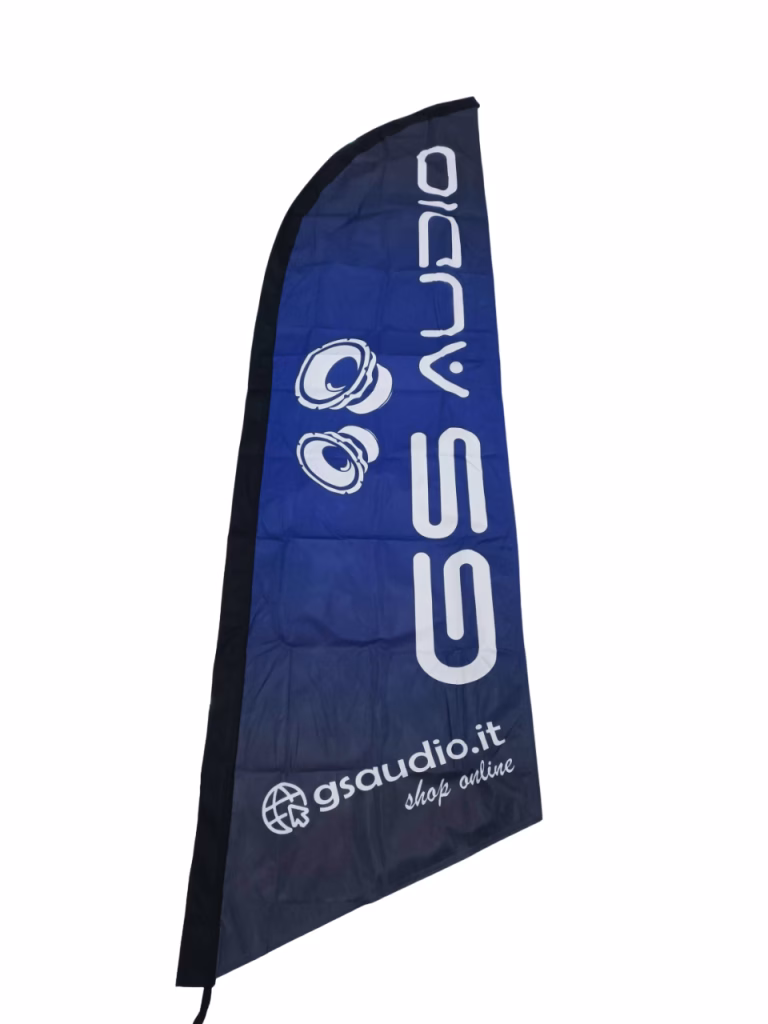 GS AUDIO Sailing Advertising FlagSailing advertising flag with GS AUDIO logo, ideal for events, fairs, exhibitions or point of sale. Includes support base and durable aluminum pole.Main features:Material: 100% polyesterGS AUDIO logoBase with water bag for added stabilityBag included for conveniently carrying the polesTechnical Specifications:Fabric size: 50 x 200 cmTotal flag height: 280 cmPackage contents: printed fabric, 2 aluminum poles, pedestal base, water bag, rod carrying bagQuantity: 1 piece