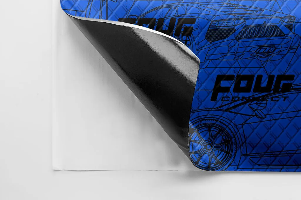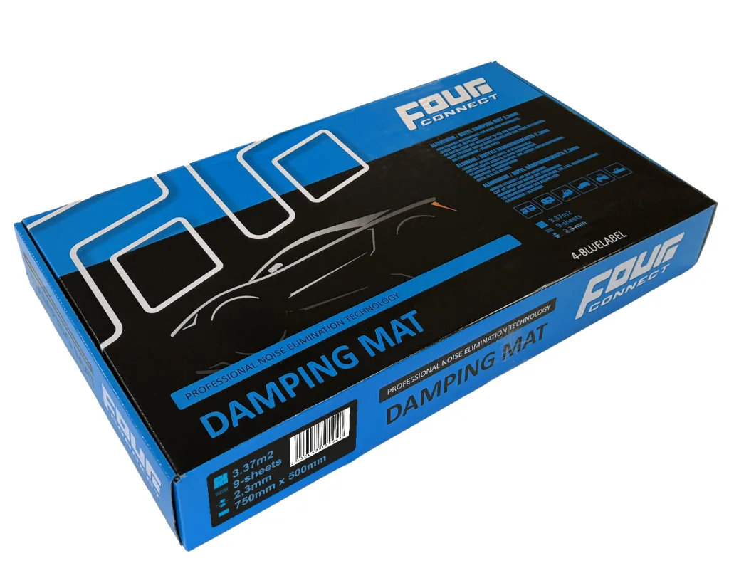 FOUR-BlueLabel on 2,3mm paksua butyylikumista valmistettua vaimennusmattoa, jossa on todella pitävä liimapinta ja vettä sekä öljyjä kestävä alumiinipinnoite.