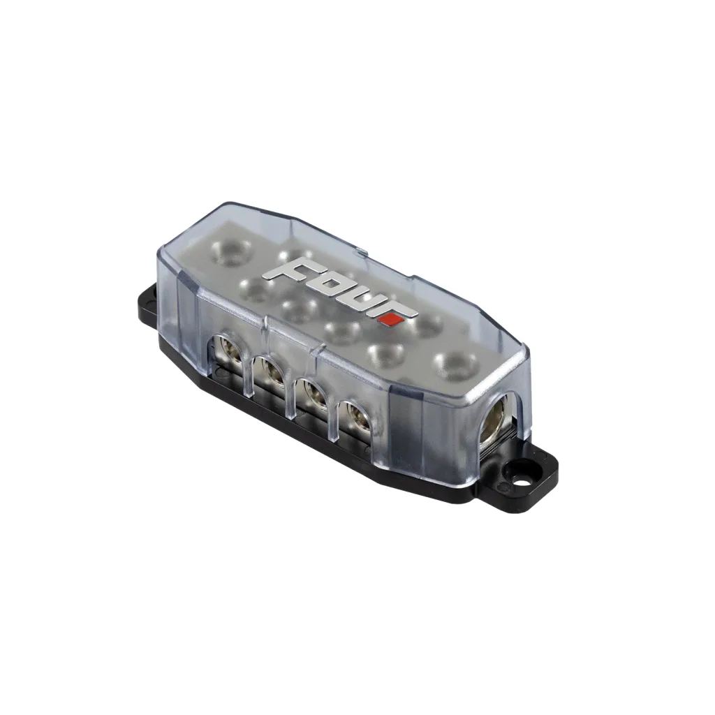 FOUR Connect STAGE2 jakoblokissa on 2×50/20mm2 sisäänmenot ja 8×20/10mm2 ulostulot virtakaapeleille.