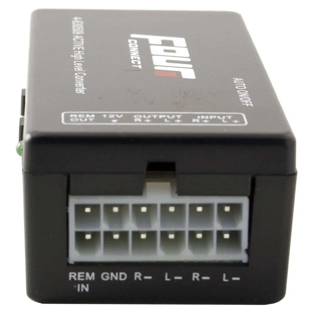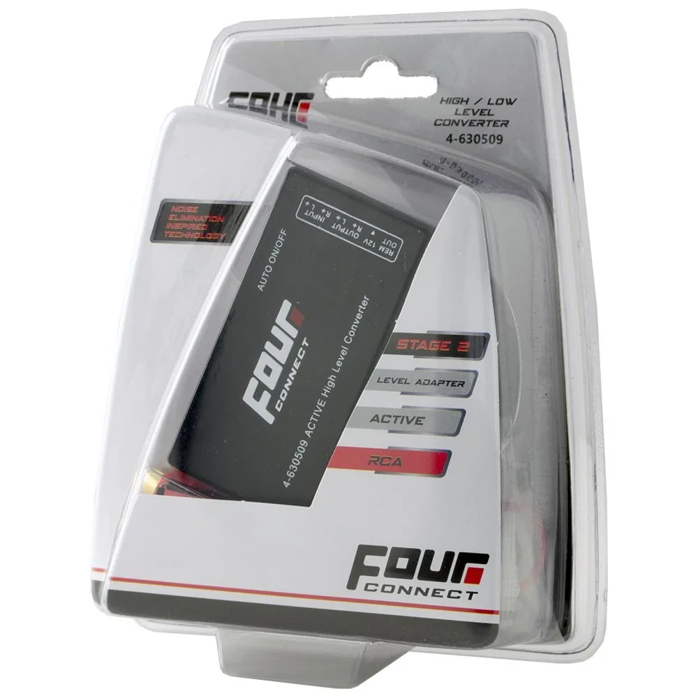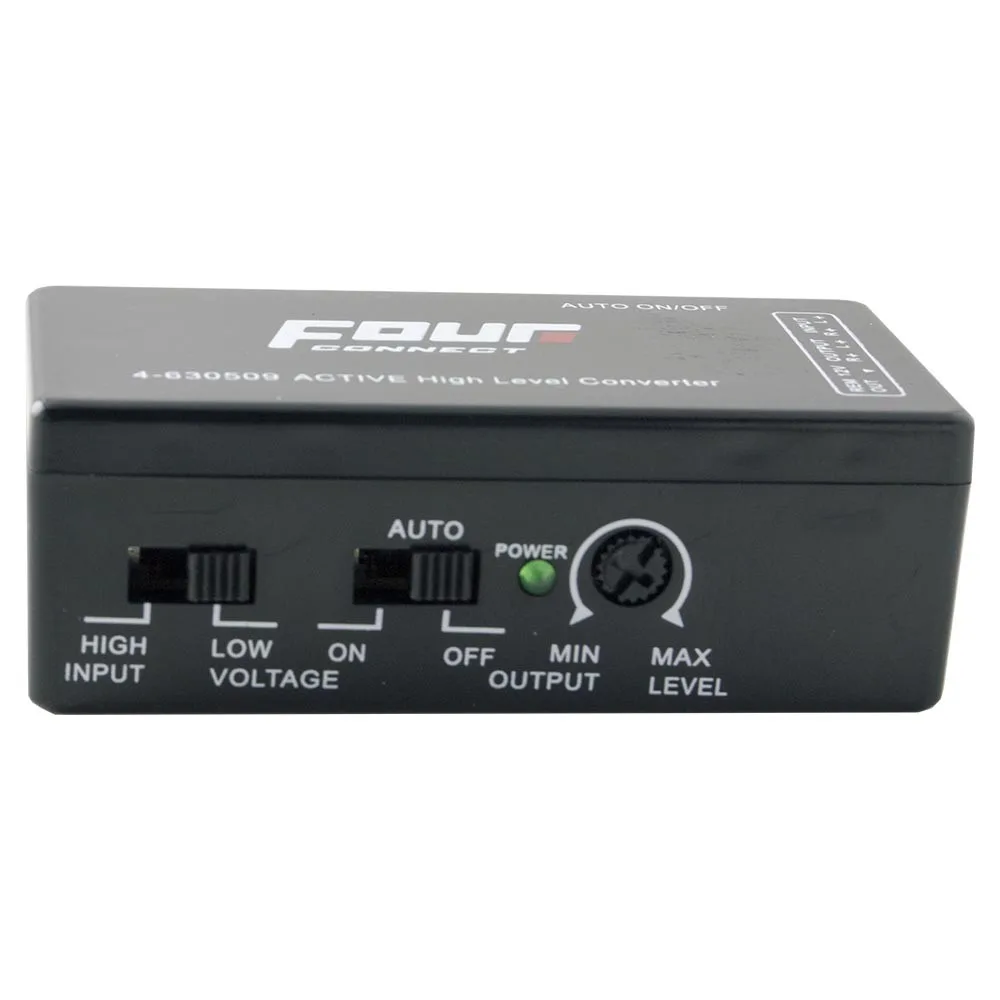 FOUR Connect 4-630509 on 2-kanavainen aktiivinen linjamuunnin. Voit muuttaa yhden parin kaiutinlähtöjä RCA-lähdöiksi. Aktiivinen linjamuunnin antaa paremman äänenlaadun kuin halvempi passiivinen muunnin. Tässä tuotteessa on yksi erinomainen ominaisuus: TASONSÄÄTÖ.