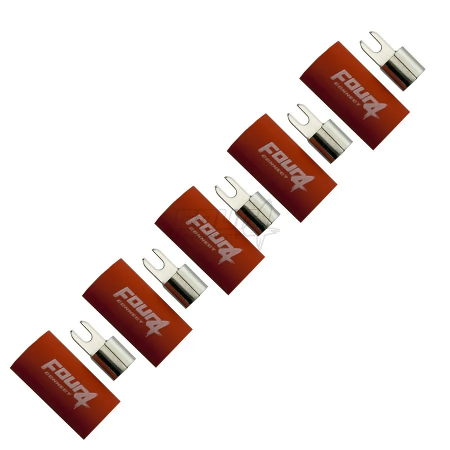 Tässä pakkauksessa on viisi punaista haarukkaliitintä. Liittimien haarukka sopii M4 pulttiin ja liittimiin käy 35 mm2 kaapeli.