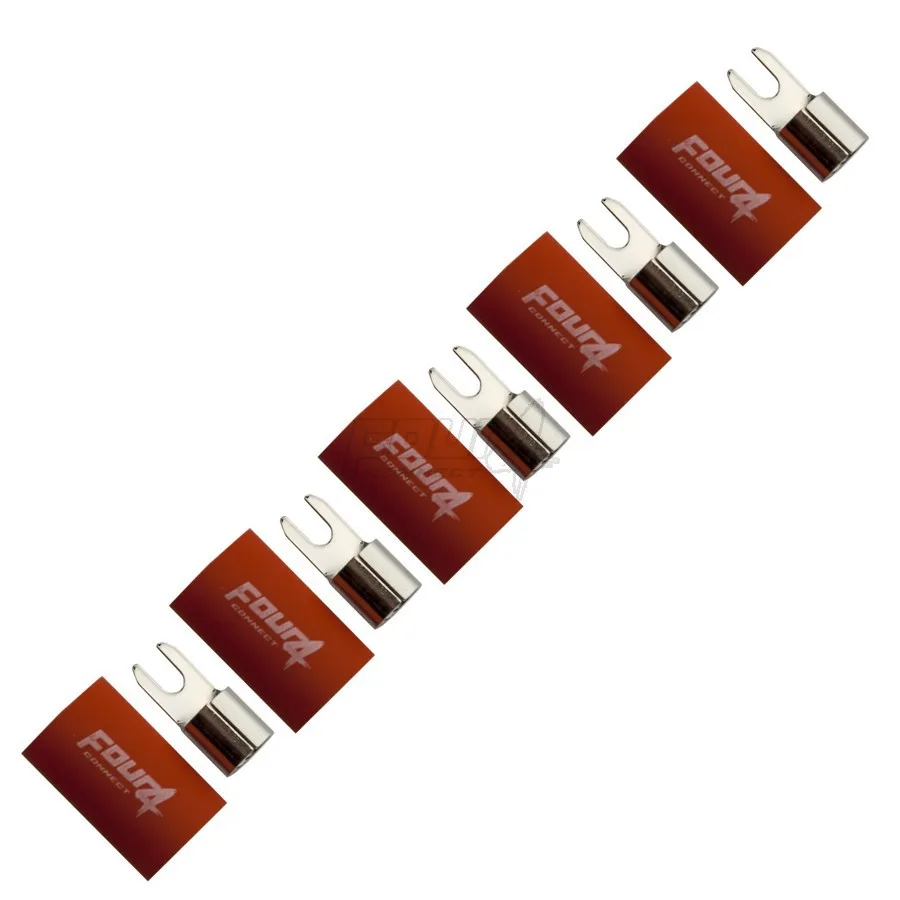 Tässä pakkauksessa on viisi punaista haarukkaliitintä. Liittimien haarukka sopii M4 pulttiin ja liittimiin käy 20 mm2 kaapeli.