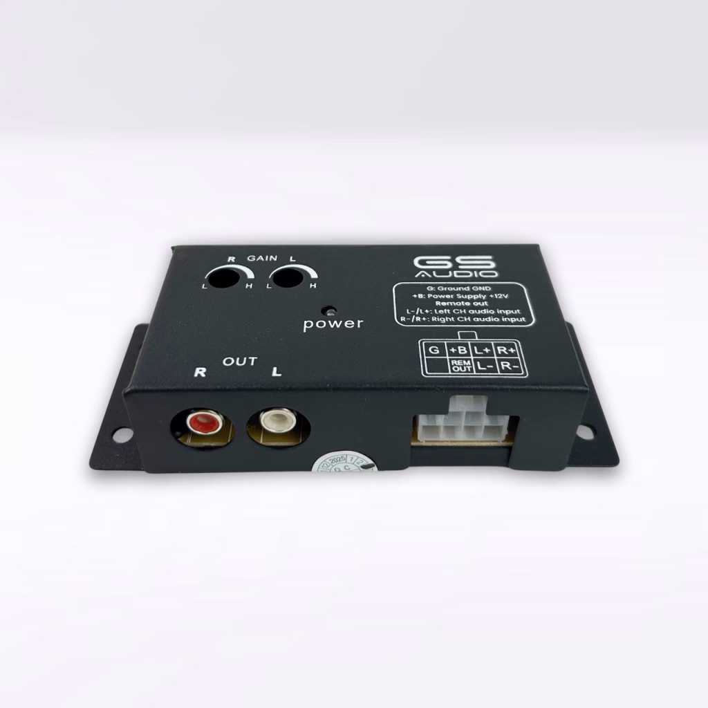 GS Audio Active 2-Channel High/Low Level Line Converter with Remote OutputThe GS Audio 2-Channel Active Line Converter allows high-level signal (car radio speaker outputs) to be transformed into low-level RCA signal, making it possible to connect to external amplifiers even with car radios without dedicated outputs. Thanks to the Remote Out, the amplifier automatically turns on when an audio signal is detected, simplifying installation. Gain adjustment trimmers for the two channels (left and right) allow for optimal sound level balance.Rugged and compact, it is the ideal solution for car audio systems that require quality, reliability and convenient installation.Technical features.Inputs: high level (L/R speaker outputs)Outputs: low-level stereo RCA (L/R)Channels: 2 (left + right)Adjustments: independent L/R gainPower supply: 12V DCRemote Out: yes (auto turn on amplifier)Format: compact, easy to install Are you looking for a 4-channel converter? On the website, in the accessories section under “Power Supply” you can find the 4-Channel High/Low Level Converter (check availability)