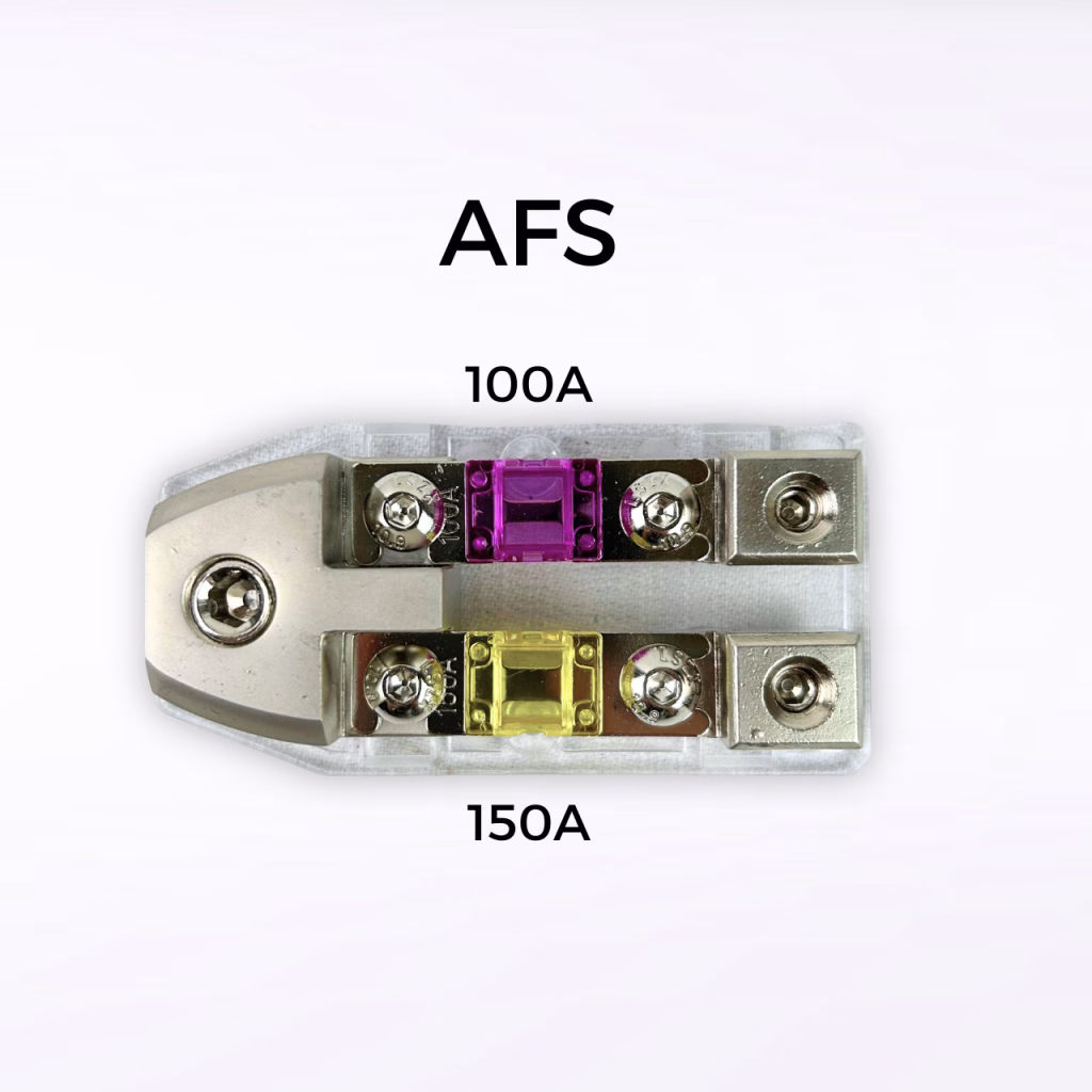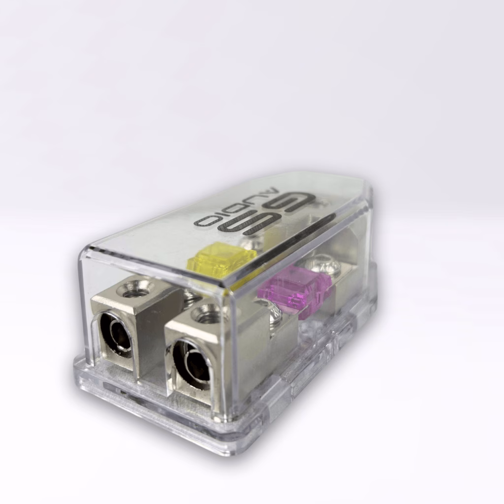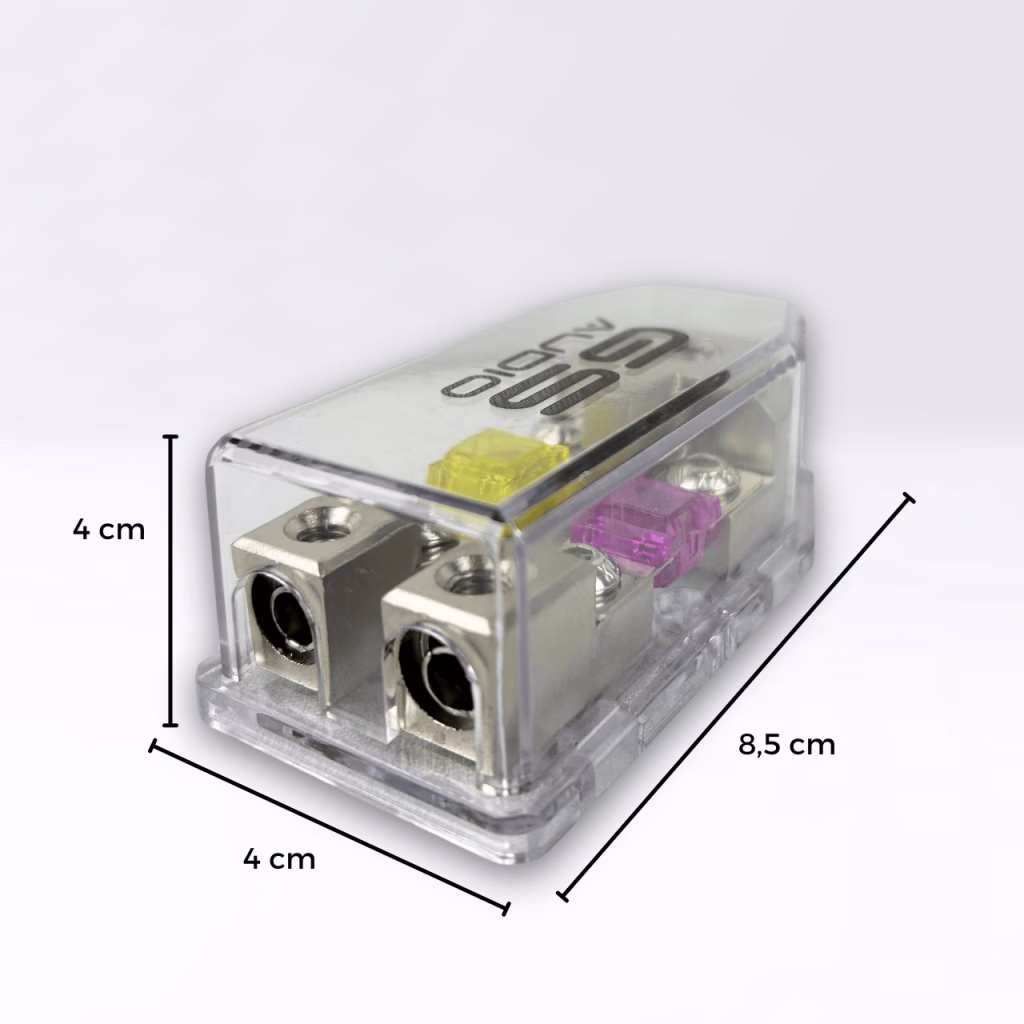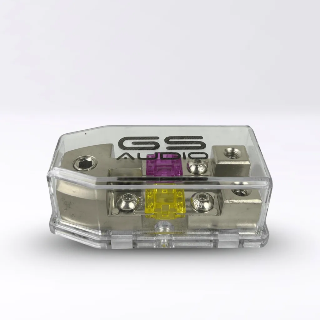 Fuse holder GS Audio AFS 2-Way IN:1×70 OUT:2x25Input Cables: 1 Cable of 70mmq cross section (or with 35 / 25mmq reduction)Output Cables: 2 Cables of 25mmq cross sectionFuses included: 2 Fuses one 150A and one 100A installed in the 2 ways.GS Audio professional fuse holder with 1 input and 2 outputs, designed for high performance car audio systems. Compatible with AFS and MINI ANL fuses, provides protection and power distribution in an orderly and safe manner. The body is made of impact-resistant plastic with a transparent laser-etched plexiglass cover that protects the contacts from dust and damage. The plated brass terminals feature Allen clamping, ensuring a solid connection and optimum current transmission.Key features:2 AFS fuses includedPlexiglass coverClamping plated brass terminalsIN:1x70mmq OUT:2x25mmq Need more fuses? Buy them on our website, available ANL up to 600A and AFS up to 150A
