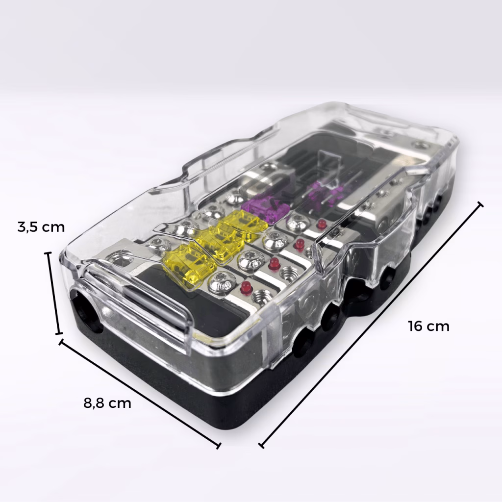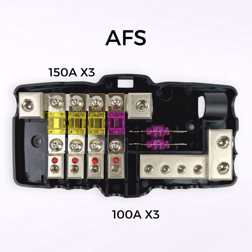 Fuse holder GS Audio AFS 4-Way IN:2×50 OUT:4×25 + negative Input Cables: 2 Cables of 50mmq cross section (or with 35 / 25mmq reduction)Output Cables: 4 Cables of 50mmq cross section (or with 35 / 25mmq reduction)Fuses included: 3 150A fuses + 1 100A fuse installed in the 4 ways. 2 spare 100A fuses.The AFS GS Audio fuse holder is the ideal solution for complex and powerful car audio systems. It allows you to install up to 4 AFS fuses and handle 6 negative connections, simplifying wiring and ensuring a clean, safe and professional installation.The high-strength plastic body has a laser-etched clear plexiglass cover with GS Audio logo, protecting connections from dust, shock, and accidental short circuits. Connection terminals are plated brass with socket-tightening screws, ensuring excellent conductivity and mechanical strength. Ideal for those wishing to protect multiple power lines or divide loads neatly, it is perfect for systems with multiple amplifiers, DSPs, or on-board accessories.!!Exclusive advantage!!!Presence of built-in LED indicators on each fuse. In the event of a blown fuse, the corresponding LED lights up, allowing immediate identification of the fault without the need to disassemble anythingKey features:4 fuses (+2 spare fuses)6 built-in negative connectionsLED indicators on fusesPlexiglass coverClamp-plated brass terminals Need more fubiles? Purchase them on our website, available ANL up to 600A and AFS up to 150A