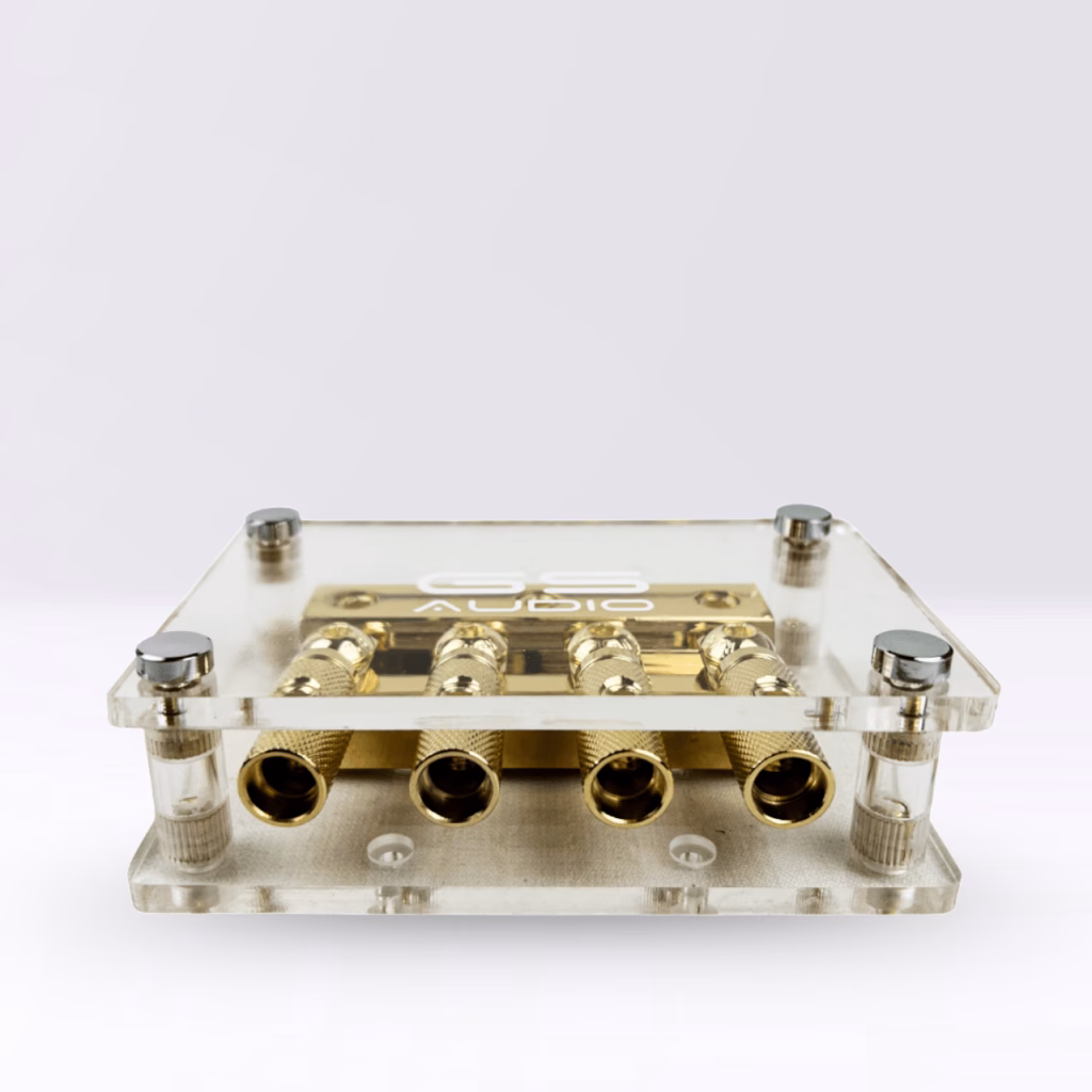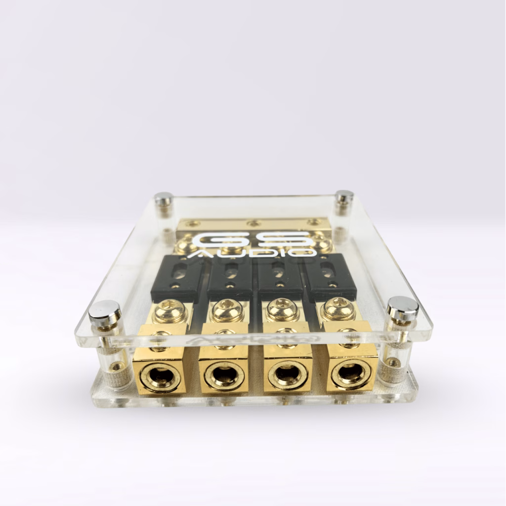 GS Audio ANL fuse holder IN:3×70 OUT:4×70 | Positive and Negative | 4-WayPositive fuse holder connections: 3 input connections (2 are on the side) for cables up to 70mmq (with reduction to 35mmq). 4 output connections for cables up to 70mmq (with reduction). Negative fuse holder connections: 3 input connections (2 are on the side) for cables up to 70mmq (with reduction to 35mmq). 4 outlet connections for cables up to 50mmq (with reduction)Fuses: 4 ANL 200A fuses.Configuration electrical: 4 ways in parallel via ANL fuses (4x200A).GS Audio professional fuse holder with separate handling for positive and negative poles. The positive section has 3 inputs for cables up to 70mm² and 4 outputs up to 70mm², while the negative section offers 3 inputs of 70mm² and 4 outputs of 50mm².Ideal for high-power car audio systems or multi-battery configurations. Made with nickel-plated brass components, it provides resistance to oxidation and stable conduction over time. Transparent shockproof plexiglass cover with engraved GS Audio logo protects contacts from dust and accidental shocks. Fuses included in the package.Key features:Supported fuse type: ANLCable compatibility: up to maximum cross-sectional area of 70 mm²Cover: shockproof plexiglass protective cover with engraved GS Audio logoMounting holes: prepared for secure mounting on panels or structuresIdeal for installations with multiple power lines or dual battery systemsElegant, striking look with gold-colored finish: definitely won’t go unnoticed, perfect for installations to show off. Applications:High-power car audio systemsConnection between batteries or LTO/LiFePO4 banksInstallations on RVs, industrial and marine vehiclesProtection of main power supplies or lines from oversized alternators Need more fuses? Purchase them on our website, available ANL up to 600A and AFS up to 150A