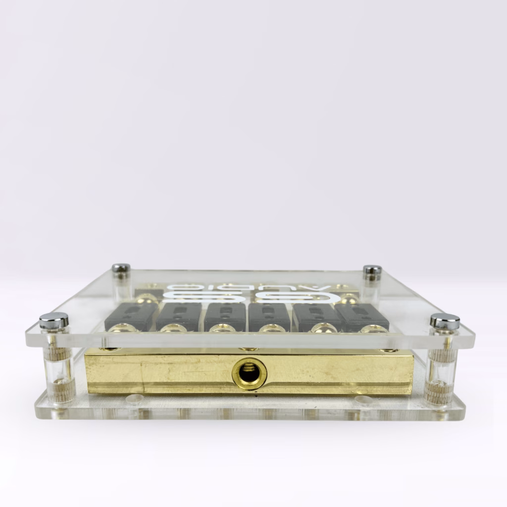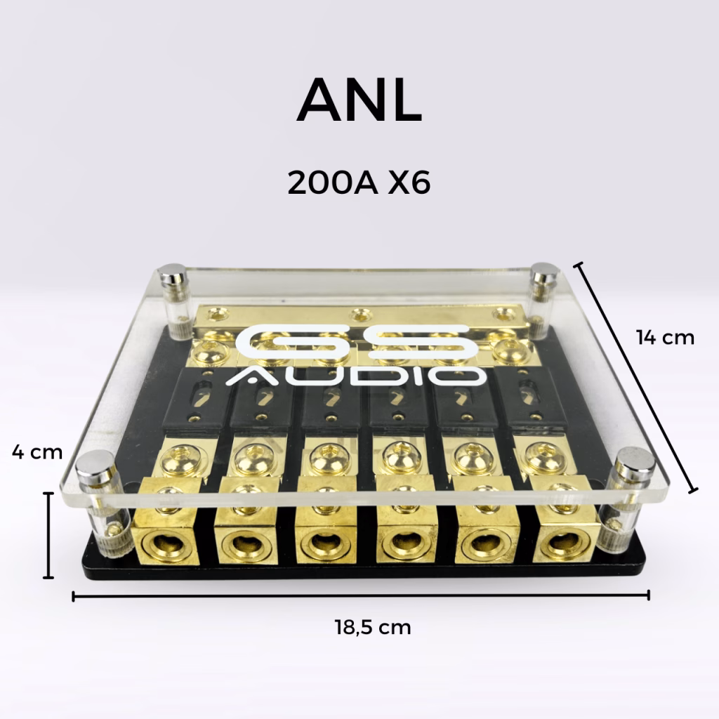 GS Audio ANL Fuse Holder IN:3×70 OUT:6×70 | Positive Only | 6-WayPositive Only Fuse Holder Connections: 3 input connections (2 are on the side) for cables up to 70mmq (with reduction to 35mmq). 6 output connections for cables up to 70mmq (with reduction). Fuses: 6 ANL 200A fuses.Configuration electrical: 6 ways in parallel via ANL fuses (6x200A).GS Audio professional fuse holder. The positive section has 3inputs for cables up to 70 mm² and 6 outputs up to 70 mm². If you need the negative section, within the category Fuses and Fuse Holders you can find the product with Positive and Negative. Ideal for high-power car audio systems or multi-battery configurations. Made of nickel-plated brass components, it provides resistance to oxidation and stable conduction over time. Transparent shockproof plexiglass cover with engraved GS Audio logo protects contacts from dust and accidental shocks. Fuses included in the package.Key features:Supported fuse type: ANLCable compatibility: up to a maximum cross section of 70 mm²Cover: shockproof clear plexiglass protective cover with engraved GS Audio logo and black plexiglass bottomMounting holes: prepared for secure mounting on panels or structuresIdeal for systems with multiple power lines or dual battery systemsElegant, impactful look with gold-colored finish: definitely won’t go unnoticed, perfect for installations to show off. Applications:High-power car audio systemsConnection between batteries or LTO/LiFePO4 banksInstallations on RVs, industrial and marine vehiclesProtection of main power supplies or lines from oversized alternators Need more fuses? Purchase them on our website, available ANL up to 600A and AFS up to 150A
