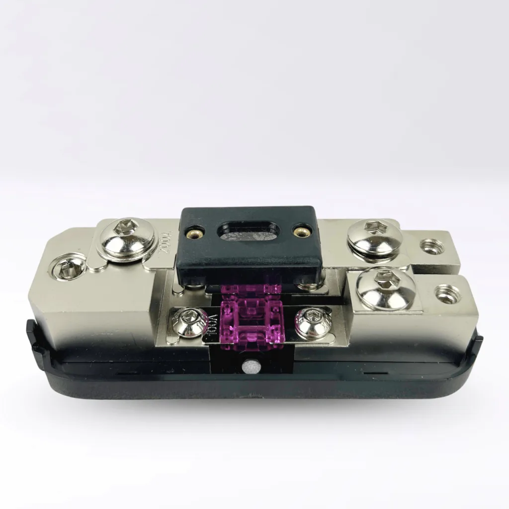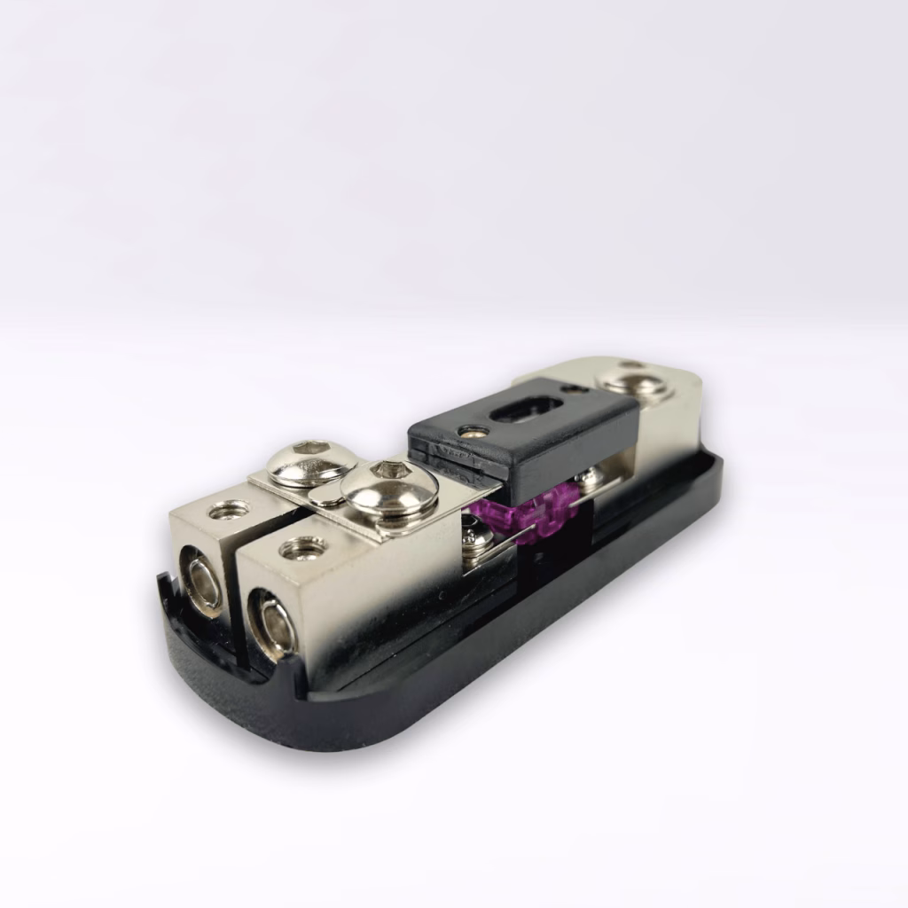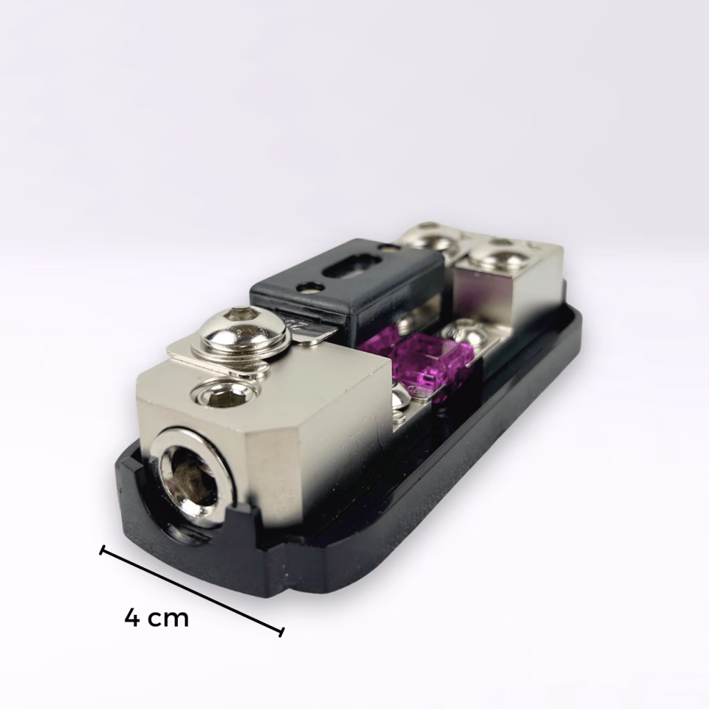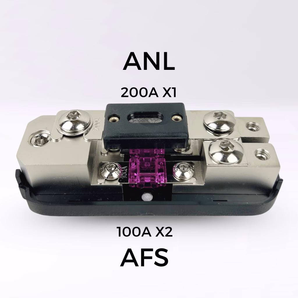 GS Audio ANL fuse holder IN:1×50 OUT:2×25 | 2-way in parallelConnections: 1 input connections for cables up to 50mmq (with reduction to 25mmq). 2 output connections for cables up to 25mmqFuse: 1 200A ANL fuse + 2 100A AFS fusesConfiguration electrical: dual way in parallel, to sum or distribute currentProfessional ANL fuse holder with input and output for cables up to 50 sq. mm, designed for high current applications in car audio, marine, industrial or special vehicle systems. Allows safe housing of ANL and AFS fuses, providing protection from overloads and short circuits on main power lines. Fuses are already included in the package.Main features:Supported fuse type: ANL and AFSCable compatibility: up to a maximum cross section of 50 mm²Cover: black opco shockproof plexiglass protective cover with engraved GS Audio logoMounting holes: prepared for secure mounting on panels or structuresIdeal for installations with multiple power lines or dual battery systemsApplications:High-power car audio systemsConnection between batteries or LTO/LiFePO4 banksInstallations on RVs, industrial and marine vehiclesProtection of main power supplies or lines from oversized alternators Need more fuses? Purchase them on our website, available ANL up to 600A and AFS up to 150A
