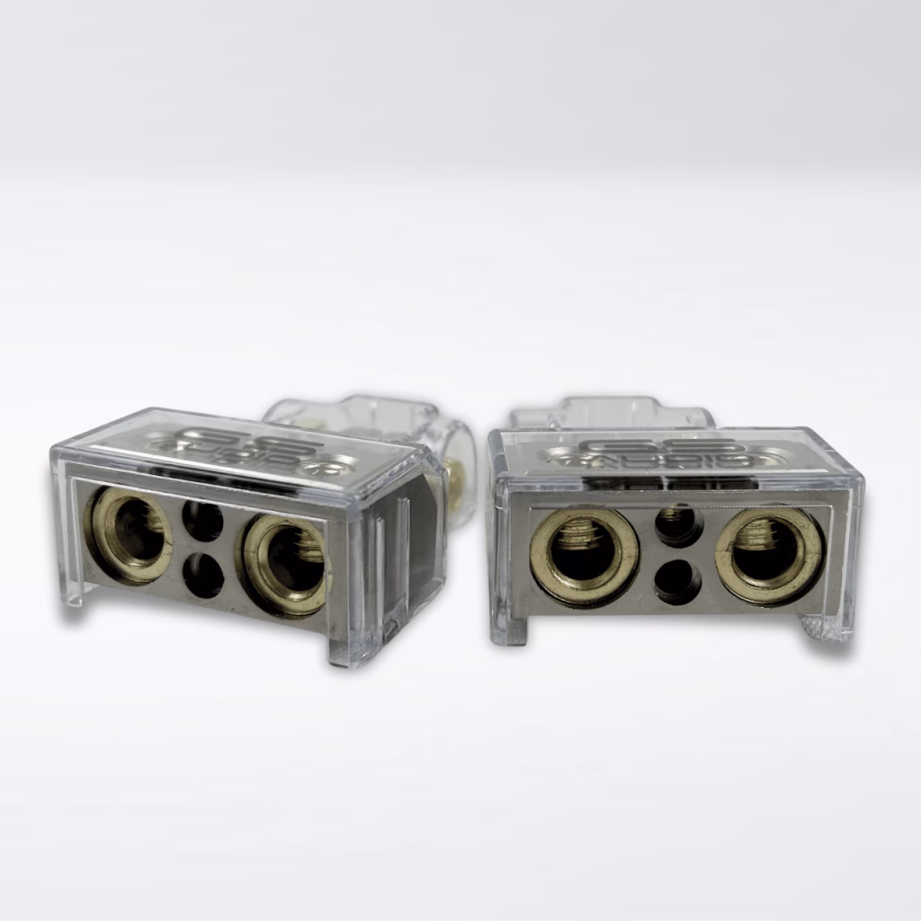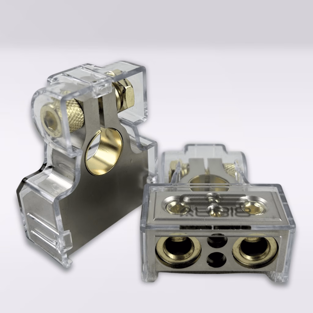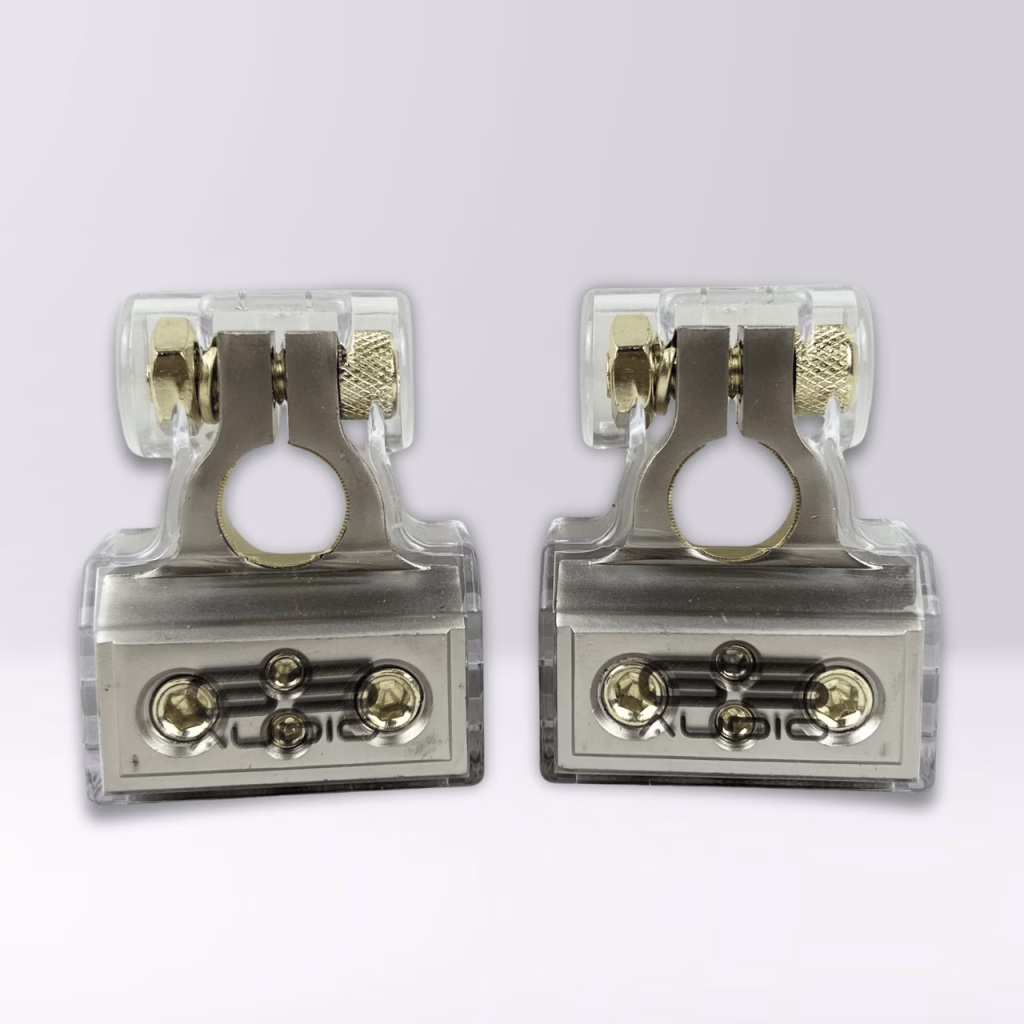 Pair of GS Audio (+/-) battery terminals with dual 2×50 mm² + 2×6 mm² inputs.GS Audio battery clamps are designed for high-performance car audio systems, ensuring a secure and stable connection to the vehicle battery. Made of nickel-plated brass with a protective clear finish, they offer maximum conductivity and resistance to oxidation and corrosion. Each clamp is equipped with high-strength clamping screws that allow secure attachment of power cables.With dual inputs (2×50 mm² + 2×6 mm²), these clamps allow multiple cable sections to be connected at the same time, making installation neater and more versatile.Technical characteristics.Material: nickel-plated brass with high conductivityPair: positive (+) terminal and negative (-) terminalConnections: 2 inputs up to 50 mm² + 2 inputs up to 6 mm²Durable, anti-corrosiongold-plated clamping screws Transparent protectivecover includedEngraved GS Audio logoBenefitsGS Audio clamps offer high electrical conductivity, are resistant to oxidation and corrosion, ensure quick and safe assembly, allow multiple cables to be connected in one clamp, and are distinguished by their robust and professional design. Looking for GS Audio batteries? LiFePo4s are available on our website, check out all the models in the dedicated category