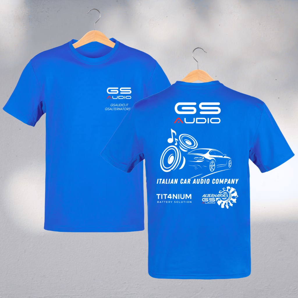 GS Audio Blue T-shirt – Official T-Shirt with Car Audio Logo and Graphics.Official GS Audio T-shirt in 100% cotton, deep blue color, made on an Atomic 150 base to ensure comfort and lightness. The GS Audio logo is printed on the front, while the back features an exclusive graphic dedicated to the world of car audio.Perfect for events, trade shows, or to represent your favorite brand in style. Unisex regular fit – available in multiple sizes.Key features:Material: 100% cotton (150 gsm)Color: BlueFront print: GS Audio logoBack print: Exclusive graphicUnisex pattern with reinforced seams