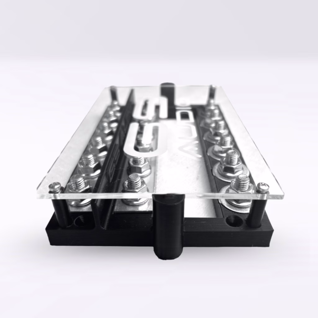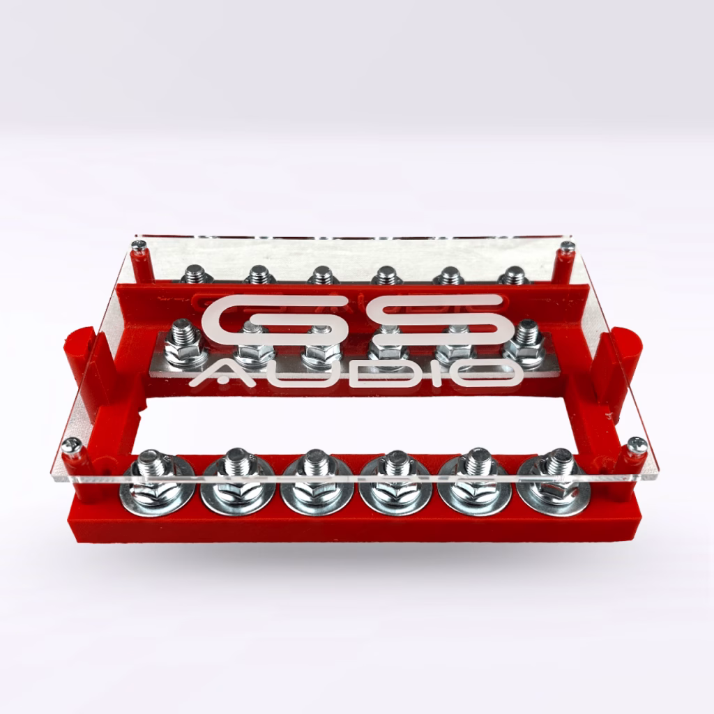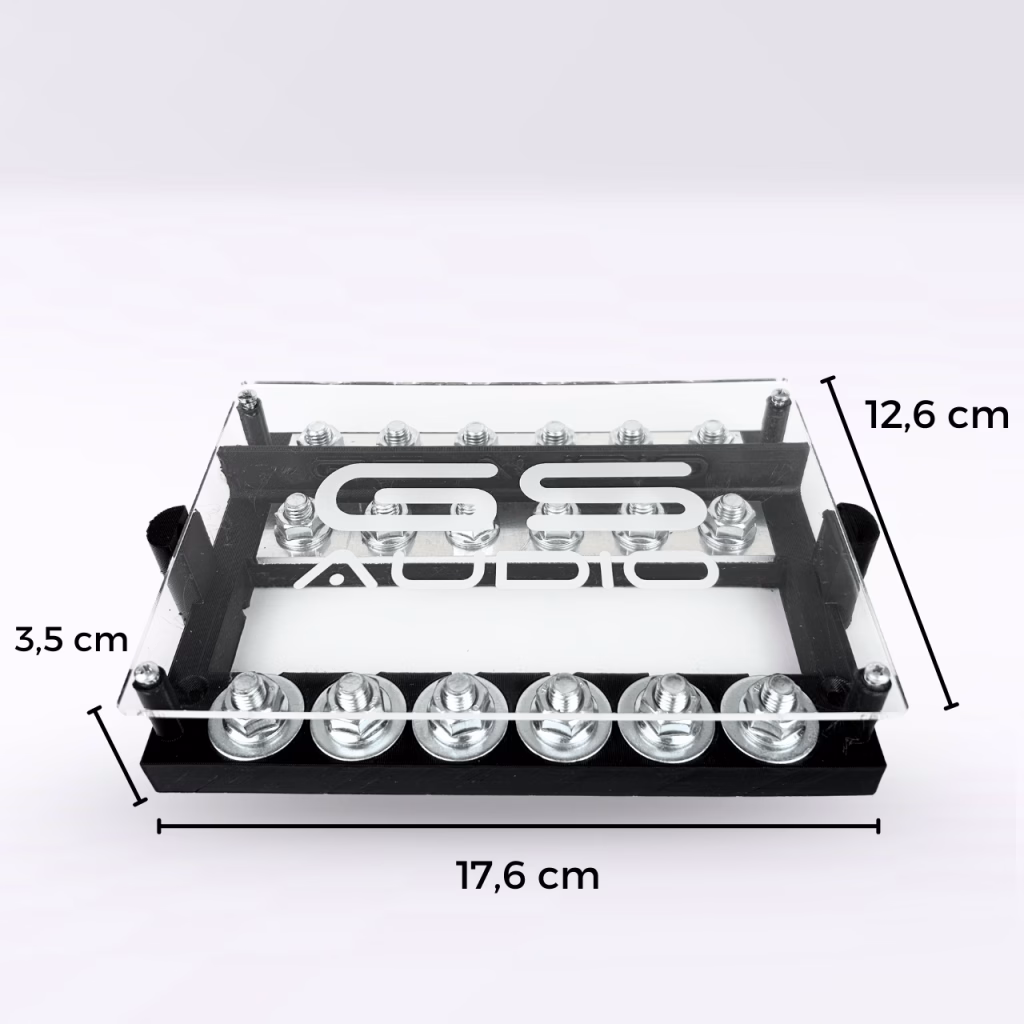 GS Audio 6 Positive + 6 Negative ANL Fuse Holder with Custom Plexiglass CoverSleek, compact and functional, this GS Audio fuse holder is designed for high-performance car audio systems that require order, safety and style. Made of high-precision 3D printing and finished with a clear plexiglass cover with laser-engraved GS Audio logo, it provides a professional look and effective protection for connections.Key features:6 positive + 6 negative connections with steel hardware includedTransparent plexiglass cover with laser-engraved GS Audio logoCompatible with ANL fuses up to 500A totalEasy installation due to pre-drilled corner holesMade in Italy – Design by GS AudioDimensions: (170.6 mm without protrusions) 190.5 x 126 x 35 mmBase material: 3D printed technical polymer + plexiglassUsage tips: for safety reasons it is recommended not to exceed 500A total to avoid excessive overheating at the terminals on the 3D printed structure.Possibility of adding fuses: fuses to be purchased separately on the website. Find available models within the Power Supply > Fuses and Fuse Holders category. Ideal for professional and advanced custom installations, this fuse holder allows you to keep your system neat and protected, with a signature GS Audio aesthetic touch.
