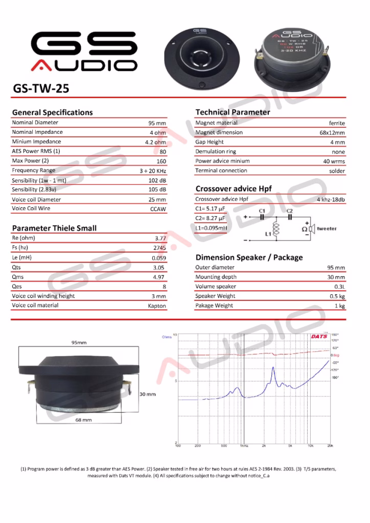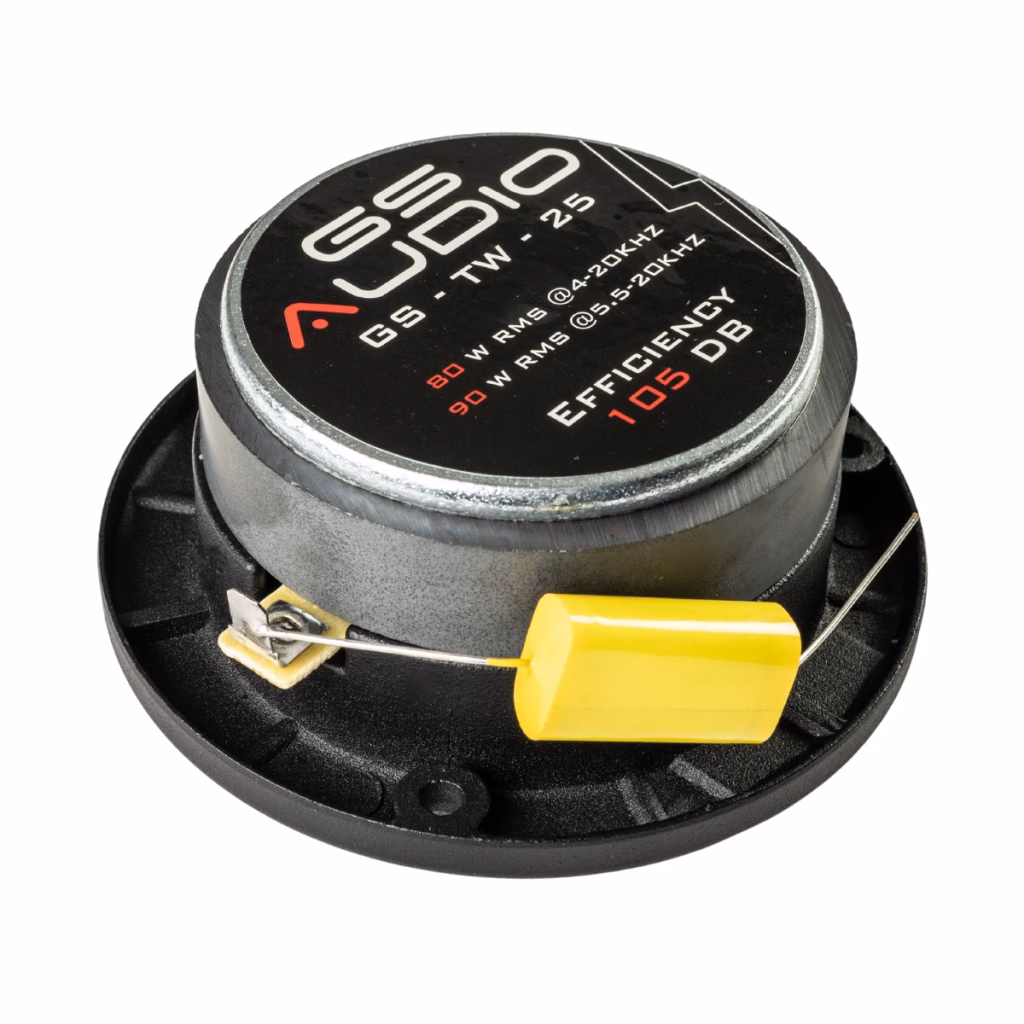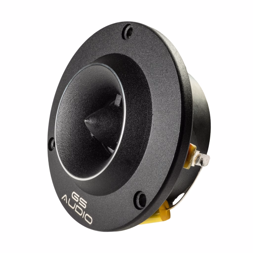 Gs Audio Driver/Tweeter 3/20KHz – 4 Ohm – 80 Wrms – voice coil 25mm – 95 mmPrice referred to the single piece The new Gs Audio compression tweeters have been selected and customized for the perfect match with our woofers in installations on screaming fronts and tuning cars.This new series guarantees a better return on wider and linear frequency for a clear, powerful and undistorted sound, thanks to the first choice materials and particularly to:high quality magnetsthroat’s diameter calibrated to increase the efficiencyhigh density plateshigh temperature voice coilalluminium rear shell for a best appearence Throughout the line there are re-coating kits