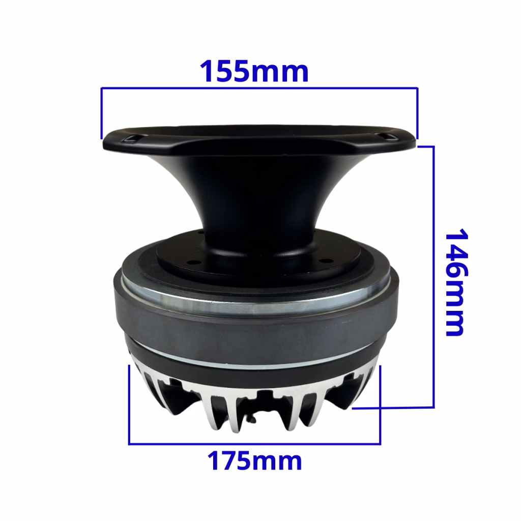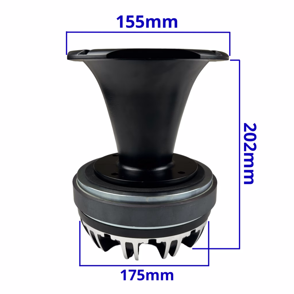 Gs Audio Driver/Tweeter 0.6/14kHz – 8 Ohm – 300Wrms – 75mm voice coilPrice referred single piecePossibility to purchase the product combined with:1 Trumpet (HR 155-66 AL) dimensions: side 155mm – installation depth 66mm – depth including flange 75mm1 Trumpet (HR 155-122 AL) dimensions: side 155mm – installation depth 122mm – depth including flange 132mmGs Audio’s new in-house Compression Tweeters have been selected and customized for the perfect match to our woofers in installations on screaming fronts and tuning cars.This new series guarantees wider and more linear frequency response, clear, powerful and undistorted sound, thanks to first-rate components such as:-high-quality magnets-calibrated throat diameter to increase efficiency-high-density plates-high-temperature coil-aluminum back cap for better aestheticsRetanning kits are available for the entire lineDownload here technical data sheet/Download here technical data sheet