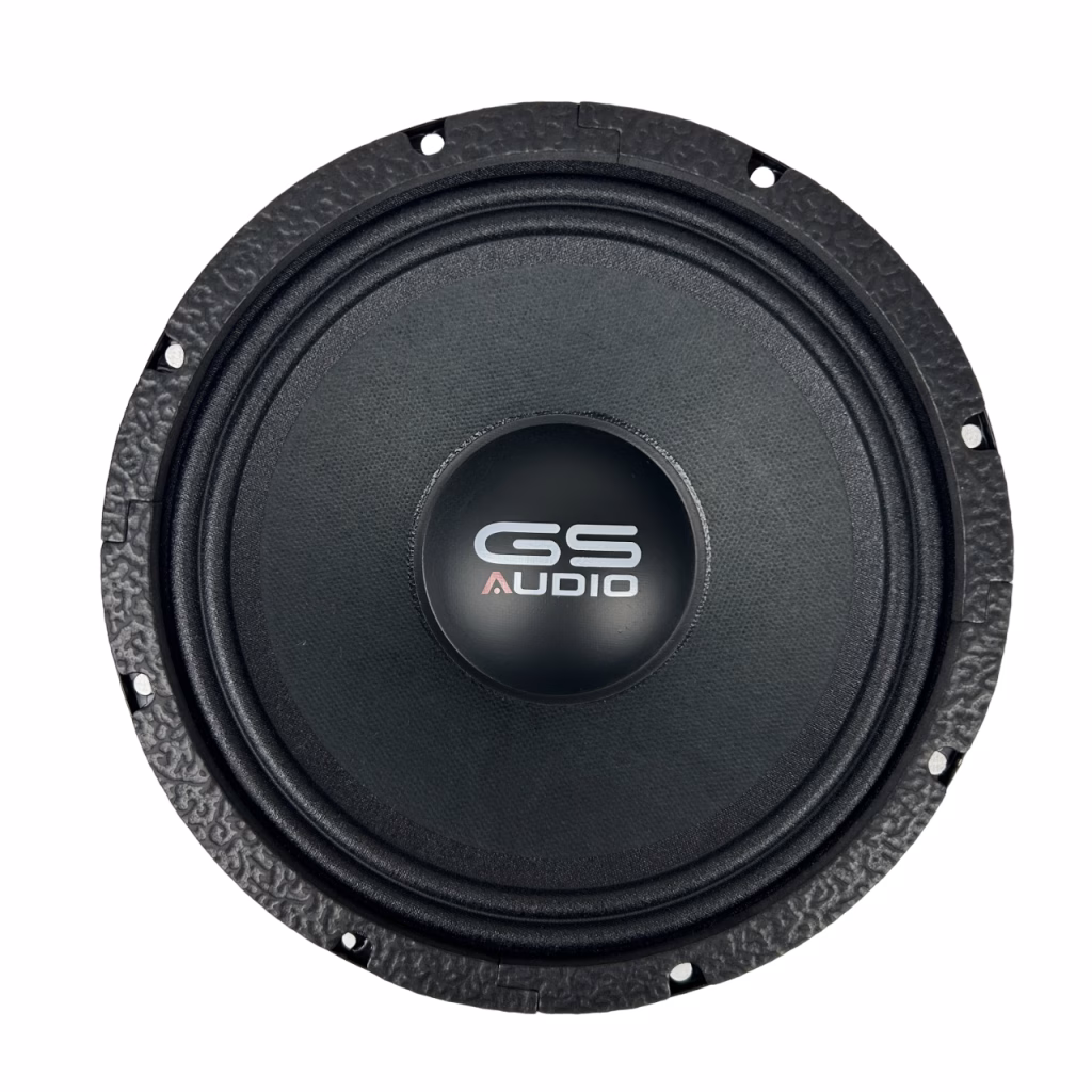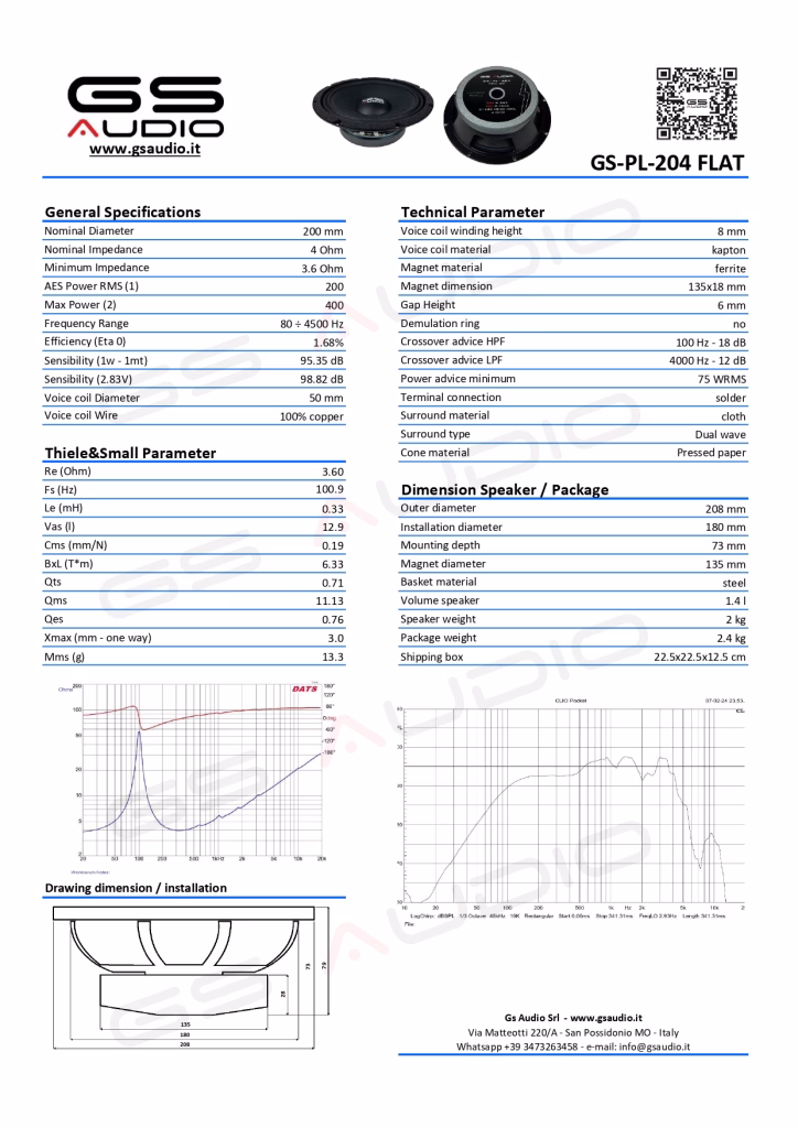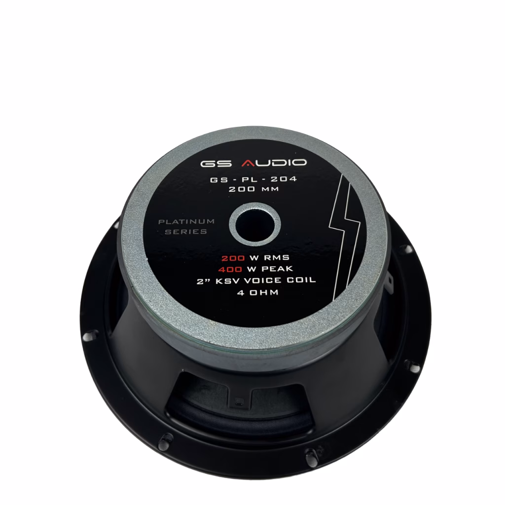 GS Audio Platinum FLAT – Woofer/Midrange 8” / 200 mm – 2” Voice Coil – 200 WRMS – 4/8 OhmPrice refers to a single piece. The Platinum FLAT series woofers are designed for customers who want to achieve very high sound pressure levels while maintaining excellent sound quality. Every component is developed and optimized within the Italian headquarters of GS Audio, the result of over 15 years of experience in the car audio industry. The Y38BH ferrite magnet ensures excellent efficiency even in compact spaces, making installation easier in limited environments. The 2” (50 mm) voice coil with vented Kapton former and CCA wire (Copper-Clad Aluminum) provides high thermal resistance and great frequency response, thanks to the light weight of the moving assembly. To ensure maximum reliability, GS Audio uses special adhesives for strong and lightweight bonding, and high-quality solder for low-resistance electrical connections. The magnetic plates are dimensioned according to the field generated by the ferrite magnet: this precise balance guarantees a strong magnetic field in the air gap, improving control, dynamics, and overall efficiency. Technical specificationsNominal diameter: 8” / 200 mmSeries: Platinum FLATVoice coil: 2” / 50 mmImpedance: 4/8 OhmRated power (RMS): 200 WMaximum power (MAX): 400 WApplication: Woofer / MidrangeScarica la scheda tenica del 4 Ohm / Download here technical data sheet 4 OhmScarica la scheda tecnica dell’8 Ohm / Download here technical data sheet 8 Ohm
