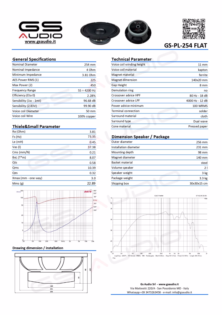 GS Audio Platinum FLAT woofer/midrange 250mm/10″ 50mm voice coil – 4/8 Ohm – 225 WRMS /450 WMAXPrice refers to single pieceThese woofers are designed for customers who want to achieve extremely high sound pressures with equally high sound quality.Gs Audio’s new home speakers are entirely designed in every part in our Italian company. Featuring a compact Y38BH ferrite magnet, they provide excellent efficiency in compact spaces for easy installation.GS Audio engineers with their 15 years of experience have succeeded in finding the right compromise between efficiency-duration-power retention-optimum timbre.The coil with perforated kapton backing and CCA filament provide a remarkable thermal seal while helping the speaker to “rise in frequency” thanks also to the lightness of the moving masses.The use of special adhesives to bond the speaker components ensures strong bonds and light weight.The highest quality tin is used to solder the coil filaments in order to have very low resistance connections.The height of the plates was dimensioned according to the amount of magnetic field generated by the ferrite, thanks to this in-depth study the field strength inside the air gap is very high.Download here technical data sheet/Download here technical data sheet (4 OHM)Download here technical data sheet/Download here technical data sheet (8 OHM)