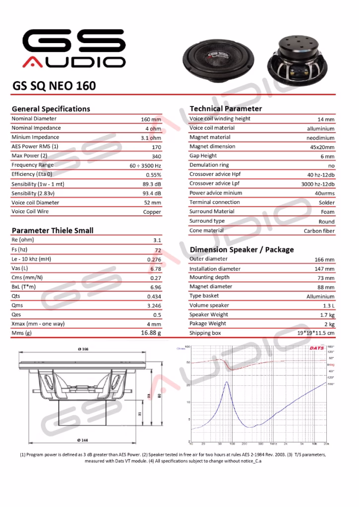 Gs Audio woofer SQ – NEO 160mm/6″ 52mm coil – 4ohm 170 WrmsPrice referred single piece / 1 pieceThe new 2023 line of Gs Audio SQ series loudspeakers, are entirely handmade in Italy at OUR headquarters.They are entirely designed by us, with significant improvements over the already excellent design of the previous series. The main innovation of this woofer is the use of neodymium magnet, which allows easy installation in tight spaces while maintaining high efficiency.The cone and bumper are made of composite fiber, characterized by extreme rigidity and light weight. This combination optimizes the loudspeaker’s performance in both low and mid frequencies, close to 2000 Hz. To achieve excellent crossover, a dome tweeter with a diameter between 25 and 30 mm is recommended.The massive magnet assembly, round foam suspension and ultra-low carbon steel plates ensure excellent efficiency and dynamics already from 50-60 hz for bass lovers in port.The Thiele and Small parameters speak for themselves. The loudspeaker’s high mechanical damping (Qms) ensures an excellent feeling of low-end sharpness, speed, and cleanliness that results in clean and precise bassTo ensure minimal spurious vibrations, the basket in addition to being made of aluminum has been painted with an anti-rumble paint of our electric blue and then turned to create a fantastic look!The terminals with solder terminals allow uperfect connection between your cables and the speakerAvailable in 4 ohm version only, including recone repair kitLimited edition customizable upon request
