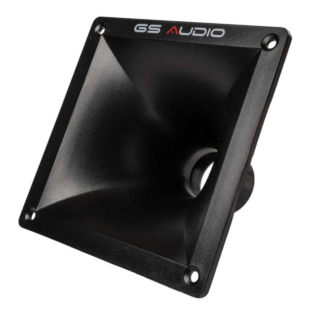 Gs Audio Horn / ABS square flange 129x129mm – height 86mm – for compression driver / tweeterPrice refers to single piece Abs horn with screw connection for Gs Audio compression tweeters and more.C: Screw connection with 35mm / 1.4″ universal thread Dimensions:D: Side 5.07″ / 129mmA: Installation depth 3.38″ / 86mmB: Total depth including flange (B) 3.54″ / 90mm