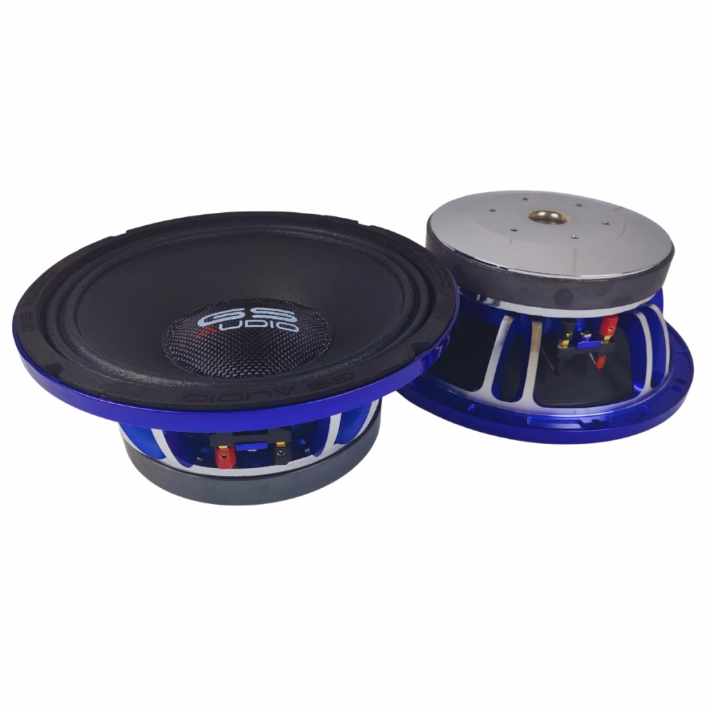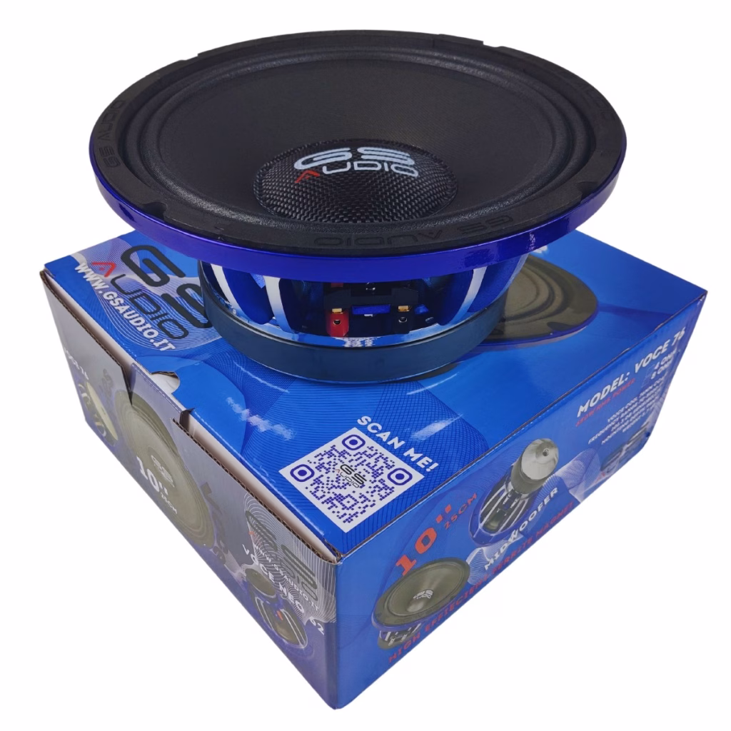 Gs Audio VOCE10 – woofer 250mm – coil 76 – 650Wrms – 4/8ohmPrice refers single piece / 1 pieceThe new 2023 line of Gs Audio VOCE series loudspeakers, are entirely handmade in Italy at Our headquarters.They are also entirely designed by us, improving on the already excellent design of the previous series. The main innovation was a new basket lower by about 5 millimeters and a Y38BH ferrite magnet with a convex bottom polar plate that allows better installation in all cars with shallow door panels.The massive magnet assembly and ultra-low-carbon steel plates provide excellent efficiency and dynamics for “dry bang” and “low in the door” enthusiasts.The copper demodulation ring inside the magnet and the coil with CCAW filament on a composite fiber backing, ensure excellent thermal sealing as well as remarkable linearity of the impedance curve, helping the loudspeaker to “frequency rise.”The Thiele and Small parameters speak for themselves. The loudspeaker’s high mechanical damping (Qms) ensures an excellent feeling of sharpness in the low range, speed and cleanliness that results in a clean and precise bassTo ensure minimal spurious vibrations, the basket in addition to being made of aluminum has been painted with an anti-rumble paint of our electric blue and then turned to create a fantastic look!Spring clamp terminals allow for quick and easy installation, and the pressed cellulose membranes have also been treated by UV protection paint to prevent deterioration/color change over timeThe entire line is available in 4- and 8-ohm versions, including recone repair kitDownload pdf VOCE 10 4ohm data sheet hereDownload here the data sheet pdf VOCE 10 8ohm