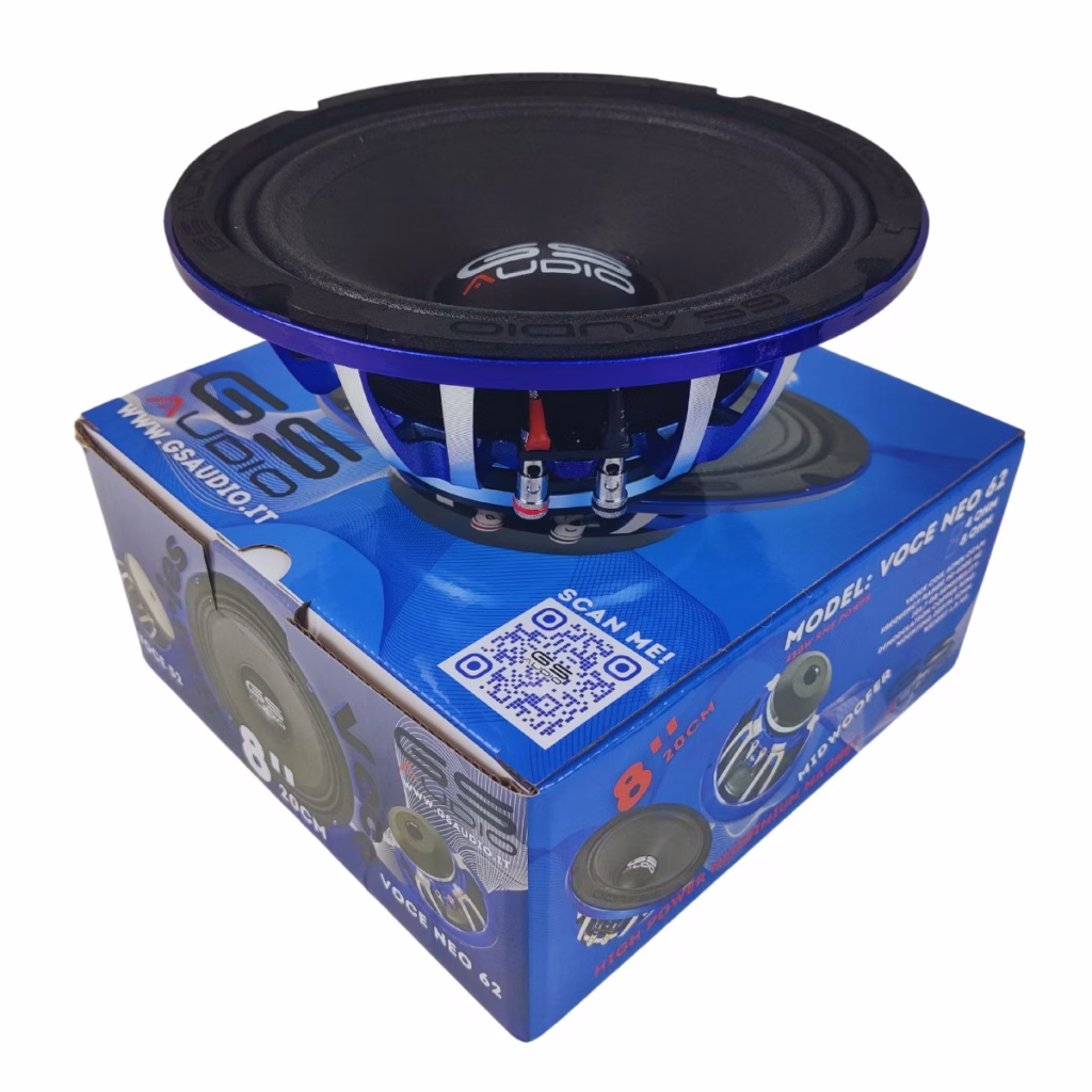 Gs Audio VOCE8 NEO – 200mm woofer – 62 coil – 450Wrms – 4/8ohmPrice refers to single pieceThe new ultralight speakers from Gs Audio are entirely designed and manufactured in our Italian company. This New 8″/200mm loudspeaker features a compact but powerful neodymium magnet with full ring grade N54 that guarantees high magnetic force and a large 62mm voice coil capable of supporting high power up to over 400wrms.Installation depth under basket only 82mm. Weight only 1.8kg!The Tjoke machined from a single piece of iron and The coil with CCAW filament on a composite fiber backing provides a remarkable thermal seal while the ultra-lightweight pressed cellulose cone helps the speaker at “frequency rise.” Despite the large “heavy” coil thanks to the efficiency of the magnetic assembly we can achieve a frequency response with good linearity from 100 to 3000hz on average depending on the installations and air volumes available for each speaker.The Thiele and Small parameters speak for themselves. The loudspeaker’s high mechanical damping (Qms) ensures an excellent feeling of low-end sharpness, speed, and cleanliness that results in a clean and precise low end.To ensure minimal spurious vibrations, the basket in addition to being made of aluminum has been treated with anti-rumble paint.The terminals with spring clamps, allow for easy and quick installation, in addition, the pressed cellulose membranes have been treated by varnish for UV protection that prevents deterioration/color change over timeDownload the pdf datasheet VOCE 8 NEO 4ohm hereDownload VOCE 8 NEO 8ohm datasheet pdf here.Here is a short ITA/ENG video presentation: