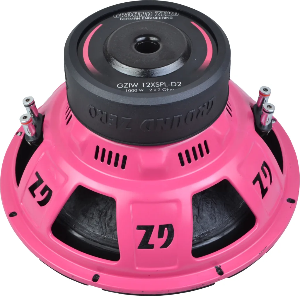 GZ Pink Powerpacked 2×12 inc sisältää 2kpl GZIW 12XSPL-D2 PINK -subwooferia, 4-AI212SLOT -kotelon sekä SD1200.1-2 EVO5 -vahvistimen.