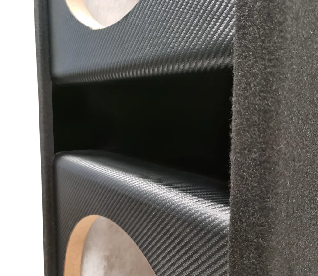 Kotelo on verhoiltu mustalla huovalla, sekä etupaneelissa on hiilikuitu-look teippi. Kotelossa on valmiiksi liitinterminaali kaapelilla.