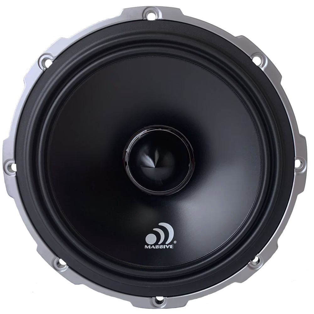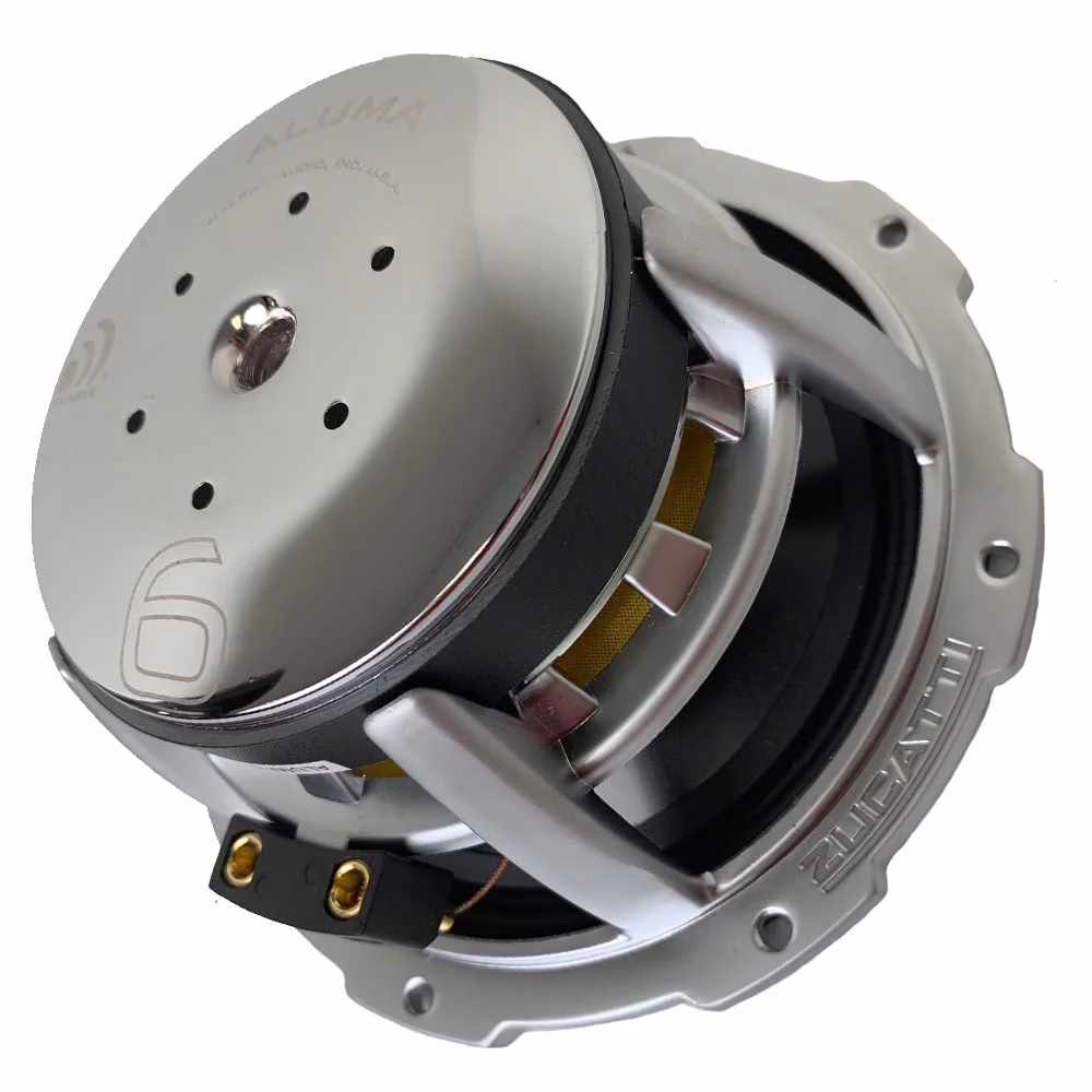 The ALUMA 6.5 Speaker (Pair of 6.5″ Speakers only) is a high-quality custom component speaker created with a very sophisticated Italian design by engineers from Zucattii™ and Massive Audio. They are built with a heavy gauge satin chrome anodized basket with pearl finish that holds high-energy Y40 magnets. An Aluminum Composite Paper Cone is surrounded with a soft butyl rubber and bonded to a 1.5″ high-temperature TILL voice coil. Due to the custom nature of the ALUMA 6, these speakers do not come with grills