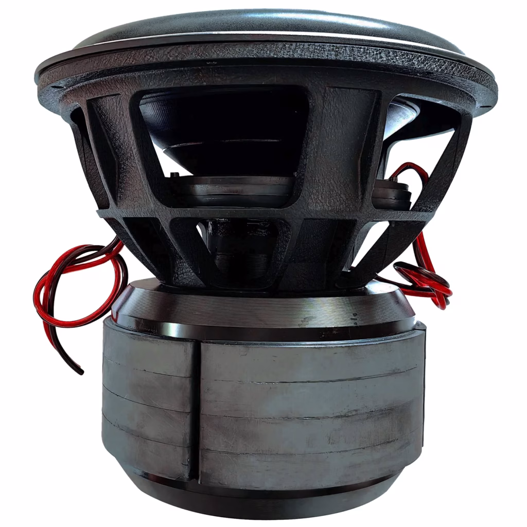 - Custom tooled aluminum gasket with massive high-energy quad-stacked 1000oz high-grade strontium magnets: This provides the subwoofer with a strong magnetic field for high power handling and efficiency.