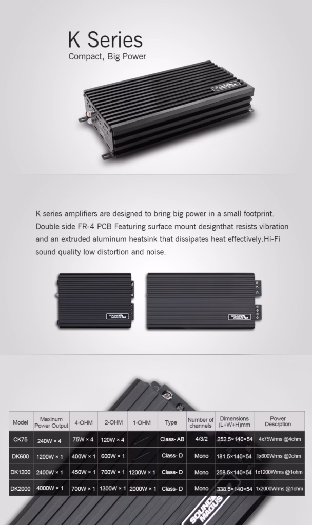 Sound Magus DK1200 on K-sarjan tehokas monovahvistin, joka on suunniteltu vaativaan subwoofer-käyttöön. Se yhdistää suuren tehon, kompaktin koon ja luotettavan rakenteen, tarjoten erinomaisen suorituskyvyn myös kovassa ja pitkäkestoisessa kuormituksessa.