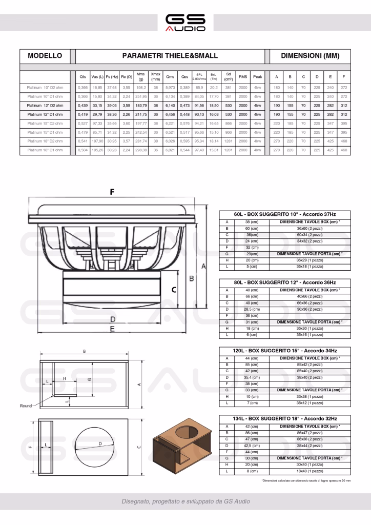 Gs Audio PLATINUM 4000 LIMITED EDITION Subwoofer – 12″/30 cm – 2000 WRMS | Impedance D2The Platinum 4000 series gets a makeover with this limited edition, featuring a round dust cover made of genuine carbon fiber, exclusive to this version. The new design is not only aesthetic but features: improved heat dissipation, thanks to the carbon structure that also promotes cooling on the front side of the coil;reduced micro-vibrations, for more stable and linear cone movement;increased overall rigidity, which improves accuracy and reliability at high powers.The GS Audio Platinum 4000 LIMITED EDITION withstands up to 2000 W RMS (D1/D2 Ohm) and is equipped with a powerful 220 mm magnetic assembly with “UFO” plates, 81 mm pure copper coil on aluminum backing, and red Nomex double-layer spider with stitched tinsel. Pressed cellulose cone, 30 mm round foam suspension and pneumatic rubber edge ensure optimum excursion and sealing, while push terminals accept cables up to 16 mm². AVAILABLE SIZES: 12″/30CM ONLYIMPEDANCE: 2 Ohms, 1 Ohm version also availableRESONANCE FREQUENCY (Fs): 33-36 Hz, ideal for everyday listening (hip hop, trap, bassone). For fast genres (techno, EDM, high BPM), we recommend reducing the boxes by about 2 inches in width to raise the box tuning by 2-3 Hz.RECOMMENDED PAIRING: to be paired with GS Audio amplifiers from 1500 to 3000 WRMS Download Platinum 4000 LIMITED EDITION Data Sheet – ITADownload Platinum 4000 LIMITED EDITION Data Sheet – ENG