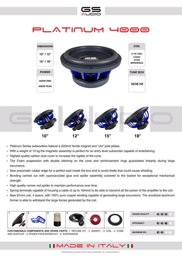 Gs Audio PLATINUM 4000 MK2 Subwoofer – 15″/38 cm – 2000 WRMS | Impedance D1 or D2 OhmThe GS Audio Platinum 4000 series gets a makeover with the new MK2 version, which brings a substantial change to the subwoofer design. The carbon dust cover, already present in the previous version, has been redesigned by our technical staff: it now has a concave shape with a hollow towards the inside. This construction choice is not only aesthetic, but brings concrete improvements to performance:More effective cooling of the voice coil, thanks to better heat dissipation even from the front side.Elimination of the micro-vibrations typical of the flat dust cover, ensuring a more stable and linear movement of the cone.Increased structural rigidity, resulting in more precision and reliability at high powers.The GS Audio Platinum 4000 MK2 withstands up to 2000 W RMS (D1/D2 Ohm) and features a powerful 220 mm magnet assembly with “UFO” plates, 81 mm pure copper voice coil on aluminum backing, and red Nomex double-layer spider with stitched tinsel. Pressed cellulose cone, 30 mm round foam suspension and pneumatic rubber edge ensure optimum excursion and sealing, while push terminals accept cables up to 16 mm². The new MK2 concave carbon dust cover increases rigidity and thermal dissipation, eliminating the micro-vibrations of flat versions. SIZES AVAILABLE: 10″/25CM – 12″/30CM – 18″/38CM – 18″/46CMIMPEDANCE: Choice of dual 1-ohm and dual 2-ohmRESONANCE FREQUENCY (Fs): 33-36 Hz, ideal for everyday listening (hip hop, trap, bassone). For fast genres (techno, EDM, high BPM) we recommend reducing the boxes about 5 cm in width to raise the box tuning by 2-3 Hz.RECOMMENDED PAIRING: To be paired with GS Audio amplifiers from 1500 to 3000 WRMS. Complete series reconditioning kits, coils, spiders, cones and original spare parts are available for all GS Audio Made in Italy subwoofers, as well as dedicated repair services with no obligation to purchase a new product.Download Platinum 4000 Data Sheet – ItalianDownload Platinum 4000 Data Sheet – English