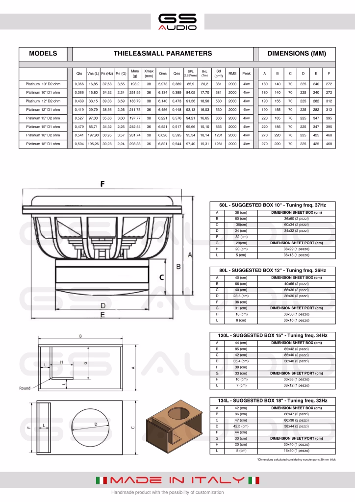 Gs Audio PLATINUM 4000 MK2 Subwoofer – 18″/46 cm – 2000 WRMS | Impedance D1 or D2 OhmThe GS Audio Platinum 4000 series gets a makeover with the new MK2 version, which brings a substantial change to the subwoofer design. The carbon dust cover, already present in the previous version, has been redesigned by our technical staff: it now has a concave shape with a hollow towards the inside. This construction choice is not only aesthetic, but brings concrete improvements to performance:More effective cooling of the voice coil, thanks to better heat dissipation even from the front side.Elimination of the micro-vibrations typical of the flat dust cover, ensuring a more stable and linear movement of the cone.Increased structural rigidity, resulting in more precision and reliability at high powers.The GS Audio Platinum 4000 MK2 withstands up to 2000 W RMS (D1/D2 Ohm) and features a powerful 220 mm magnet assembly with “UFO” plates, 81 mm pure copper voice coil on aluminum backing, and red Nomex double-layer spider with stitched tinsel. Pressed cellulose cone, 30 mm round foam suspension and pneumatic rubber edge ensure optimum excursion and sealing, while push terminals accept cables up to 16 mm². The new MK2 concave carbon dust cover increases rigidity and thermal dissipation, eliminating the micro-vibrations of flat versions. SIZES AVAILABLE: 10″/25CM – 12″/30CM – 18″/38CM – 18″/46CMIMPEDANCE: Choice of dual 1-ohm and dual 2-ohmRESONANCE FREQUENCY (Fs): 33-36 Hz, ideal for everyday listening (hip hop, trap, bassone). For fast genres (techno, EDM, high BPM) we recommend reducing the boxes about 5 cm in width to raise the box tuning by 2-3 Hz.RECOMMENDED PAIRING: To be paired with GS Audio amplifiers from 1500 to 3000 WRMS. Complete series reconditioning kits, coils, spiders, cones and original spare parts are available for all GS Audio Made in Italy subwoofers, as well as dedicated repair services with no obligation to purchase a new product.Download Platinum 4000 Data Sheet – ENGDownload Platinum 4000 Data Sheet – ENG