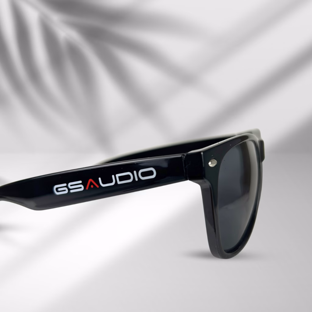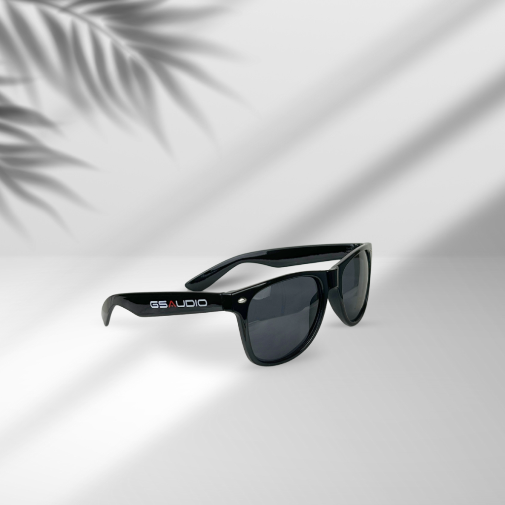 Sunglasses | GS Audio Merchandise | UV400 ProtectionAttend gatherings without worrying about the sun in your eyes anymore! GS Audio sunglasses combine modern style and comfort for a unique look. Made with durable black frames and dark lenses, they offer excellent protection from the sun. Personalized with the GS Audio logo on the frame, they are the ideal accessory for those who like to stand out.Key features:Rugged black frameDark lenses for UV protection (UV400)Personalized GS Audio logo on the templesModern and comfortable design