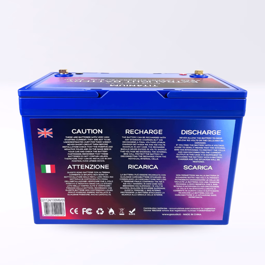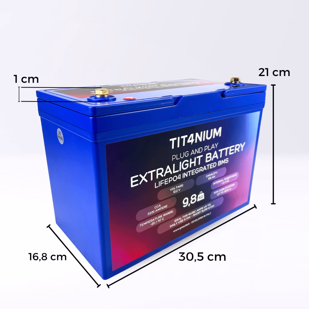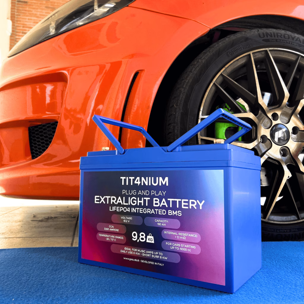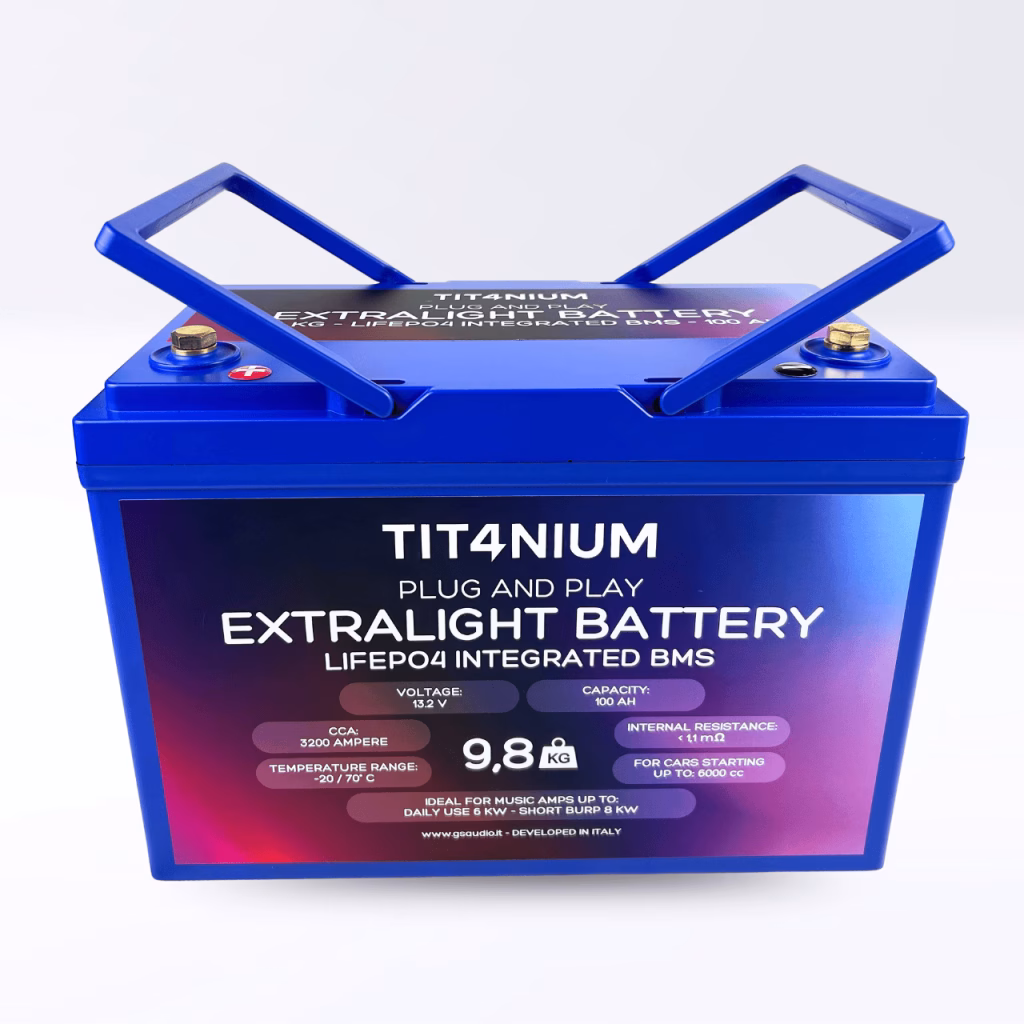 TIT4NIUM 100Ah-M8 Battery – CCA:3200A LifePo4 13.2V (30,5*21*16,8cm) The Tit4nium battery represents excellence in PLUG & PLAY high-performance batteries, combining power, light weight, and reliability in one product.Superior Performance for Demanding ApplicationsWith a capacity of 100Ah and a starting current(CCA) of about 3200A, this battery is designed to provide immediate and constant power, ideal for:High-power audio systems up to 6000W for daily use and up to 8000W for short SPL competitions;Starting engines up to 6000cc, ensuring fast and reliable starts;Competition vehicles where weight reduction and energy reliability are critical.These batteries can also be used on RVs and in situations requiring energy storage, but they express their full potential on everyday cars with sound systems, winches, or other high instantaneous electrical loads, or for those who simply want to reduce weight.Protection and Advanced Management System (BMS).The TIT4NIUM LiFePO4 100Ah-M8 13.2Vbattery is internally equipped with 4 active BMSs placed in parallel that constantly monitor and balance individual cells, offering:Overload protection: charge limit voltage 14.7 volts, above this threshold the BMSs will begin to protect the cells by sending excess voltage to resistors placed on the BMS itself;Deep discharge protection: lower limit voltage 10.8 volts, falling below this threshold the BMS will disconnect the battery’s positive terminal to prevent further discharge and safeguard cell life;Performance optimization: maximum energy efficiency due to perfect and continuous cell balancing and extended cell life;Thermal control: guaranteed operation between -20°C and +70°C.Technical Specifications and DimensionsRated voltage: 12.8VVoltage at rest from charging: 13.2VOptimal end-of-charge voltage: 14.6VMaximum protection voltage: 15VInternal resistance: