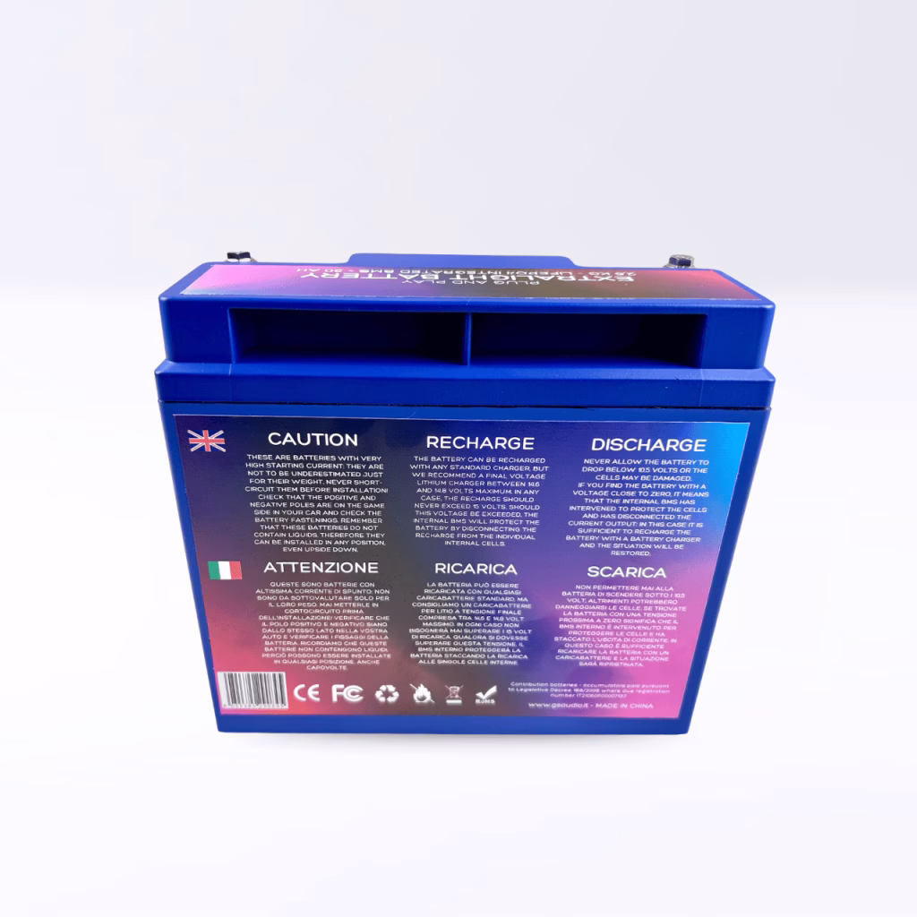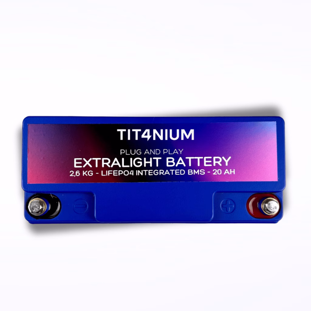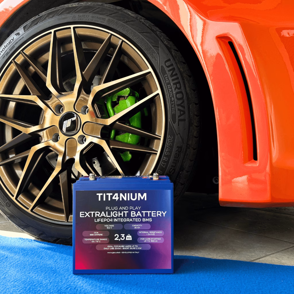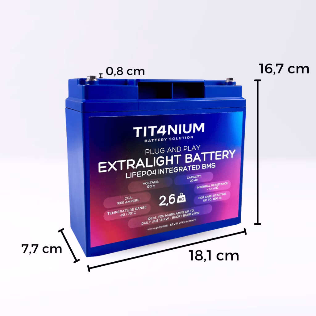 TIT4NIUM 20Ah-M5 Battery – CCA:1000A LifePo4 13.2V (18.1*7.7*17.5cm)The Tit4nium battery represents excellence in PLUG & PLAY high-performance batteries, combining power, light weight, and reliability in one product.Superior Performance for Demanding ApplicationsWith a capacity of 20Ah and a starting current(CCA) of about 1000A, this battery is designed to provide immediate and constant power, ideal for:High-power audio systems up to 1500W for daily use and up to 2000W for short SPL competitions;Starting engines up to 1600cc, ensuring fast and reliable starts;Competition vehicles where weight reduction and energy reliability are critical.These batteries can also be used on RVs and in situations requiring energy storage, but they express their full potential on everyday cars with sound systems, winches, or other high instantaneous electrical loads, or for those who simply want to reduce weight.Protection and Advanced Management System (BMS).The TIT4NIUM LiFePO4 20Ah-M5 13.2V battery is internally equipped with 4 active BMSs placed in parallel that constantly monitor and balance individual cells, offering:Overload protection: charge limit voltage 14.7 volts, exceeded this threshold the BMS will start to protect the cells by sending excess voltage to resistors placed on the BMS itself;Deep discharge protection: lower limit voltage 10.8 volts, falling below this threshold the BMS will disconnect the battery’s positive terminal to prevent further discharge and safeguard cell life;Performance optimization: maximum energy efficiency due to perfect and continuous cell balancing and extended cell life;Thermal control: guaranteed operation between -20°C and +70°C.Technical Specifications and DimensionsRated voltage: 12.8VVoltage at rest from charging: 13.2VOptimal end-of-charge voltage: 14.6VMaximum protection voltage: 15VInternal resistance: