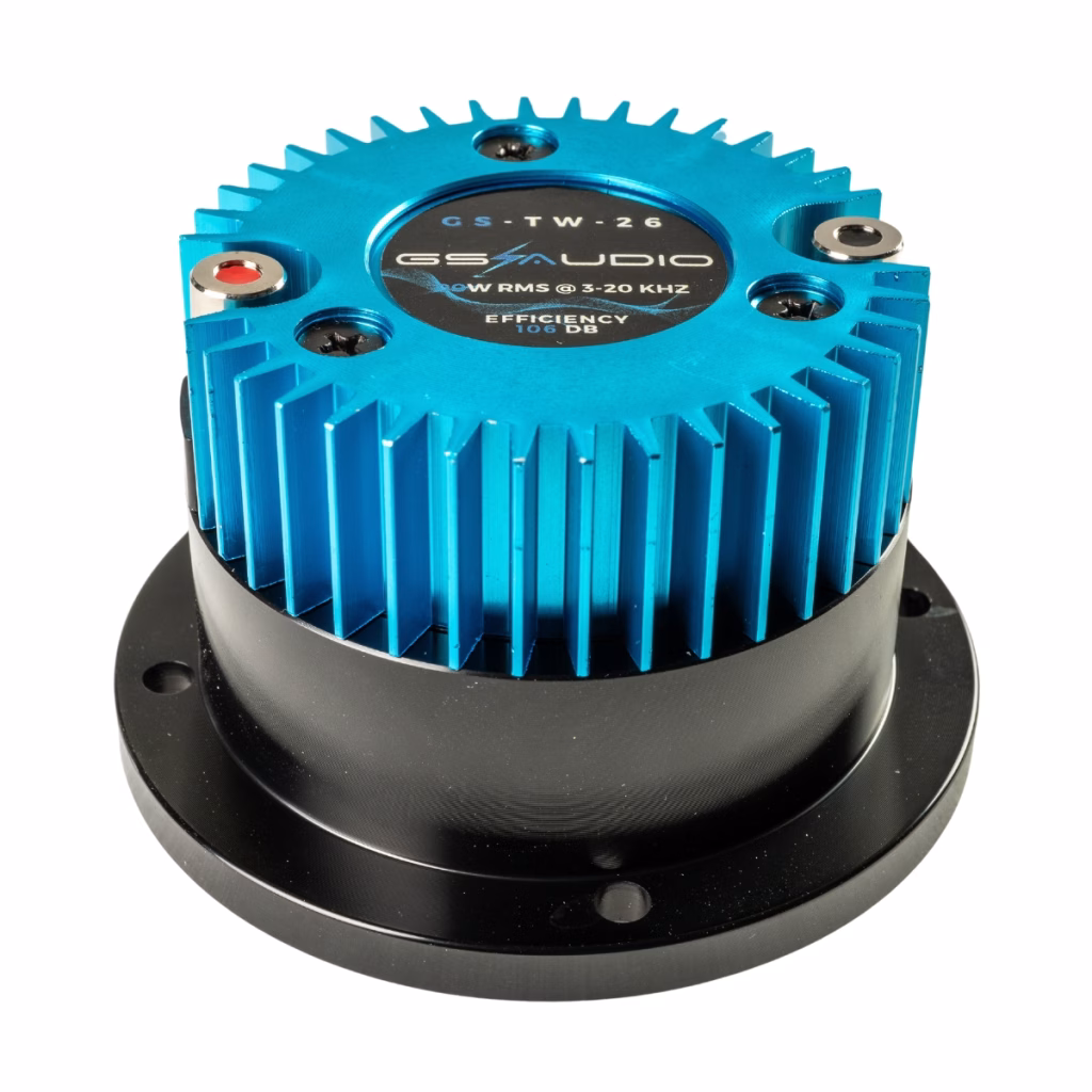 TW26NEO tweeter – 3/20KHz – 4 Ohms – 90Wrms – 26mm coilPrice refers to single pieceThe high-frequency compression driver with 43mm/1.65″ output GS TW 26 neo is designed for maximum efficiency in the smallest space.Titanium diaphragm, ultralight coil and neodymium magnet were the winning choices to achieve good linearity above 4000Hz and outstanding compactness.The center phase shifter with a high flare ensures low distortion and excellent reproduction of mid-high frequencies.The voice coil is 26mm copper clad aluminum wire (CCAW), for other features I leave you to the data sheetDownload the data sheet in PDF here